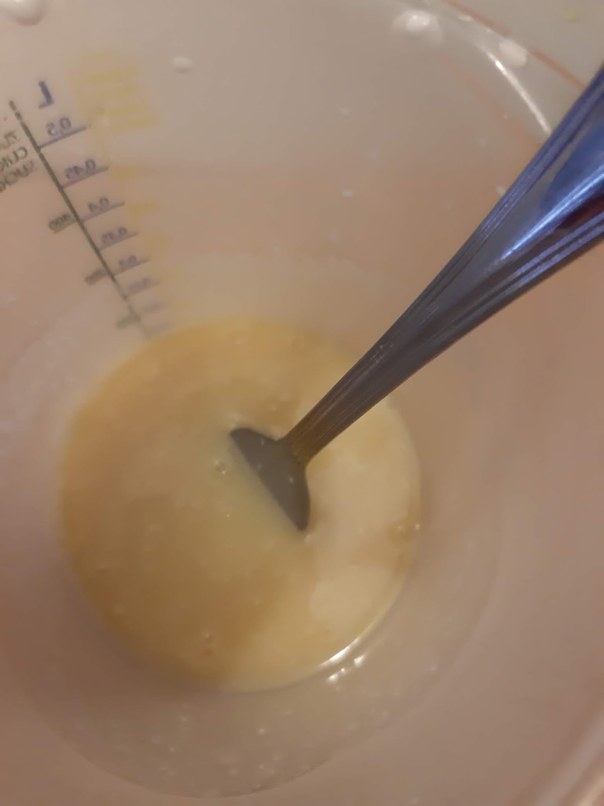 - Добавям олиото и прясното мляко.