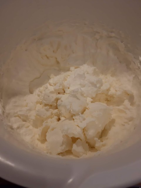 - Когато сметаната е готова, добавям крема сиренето и разбивам точно 1 минута.