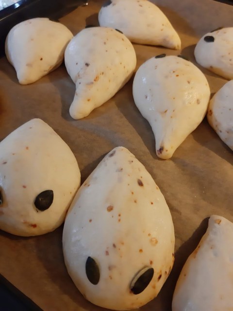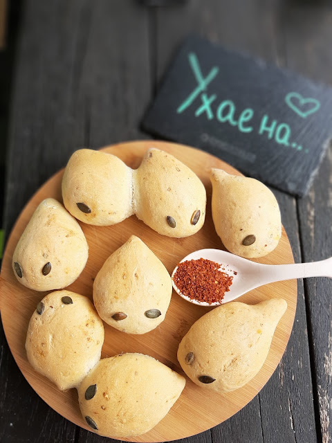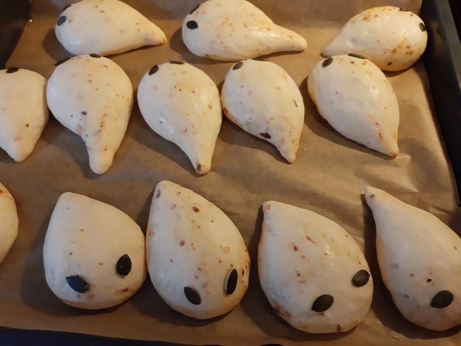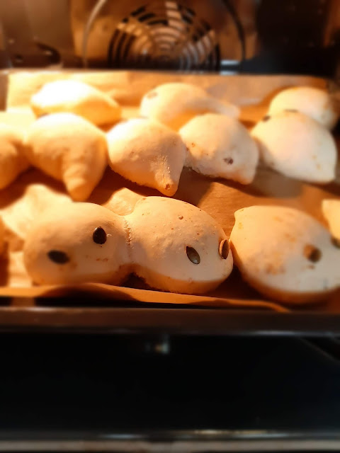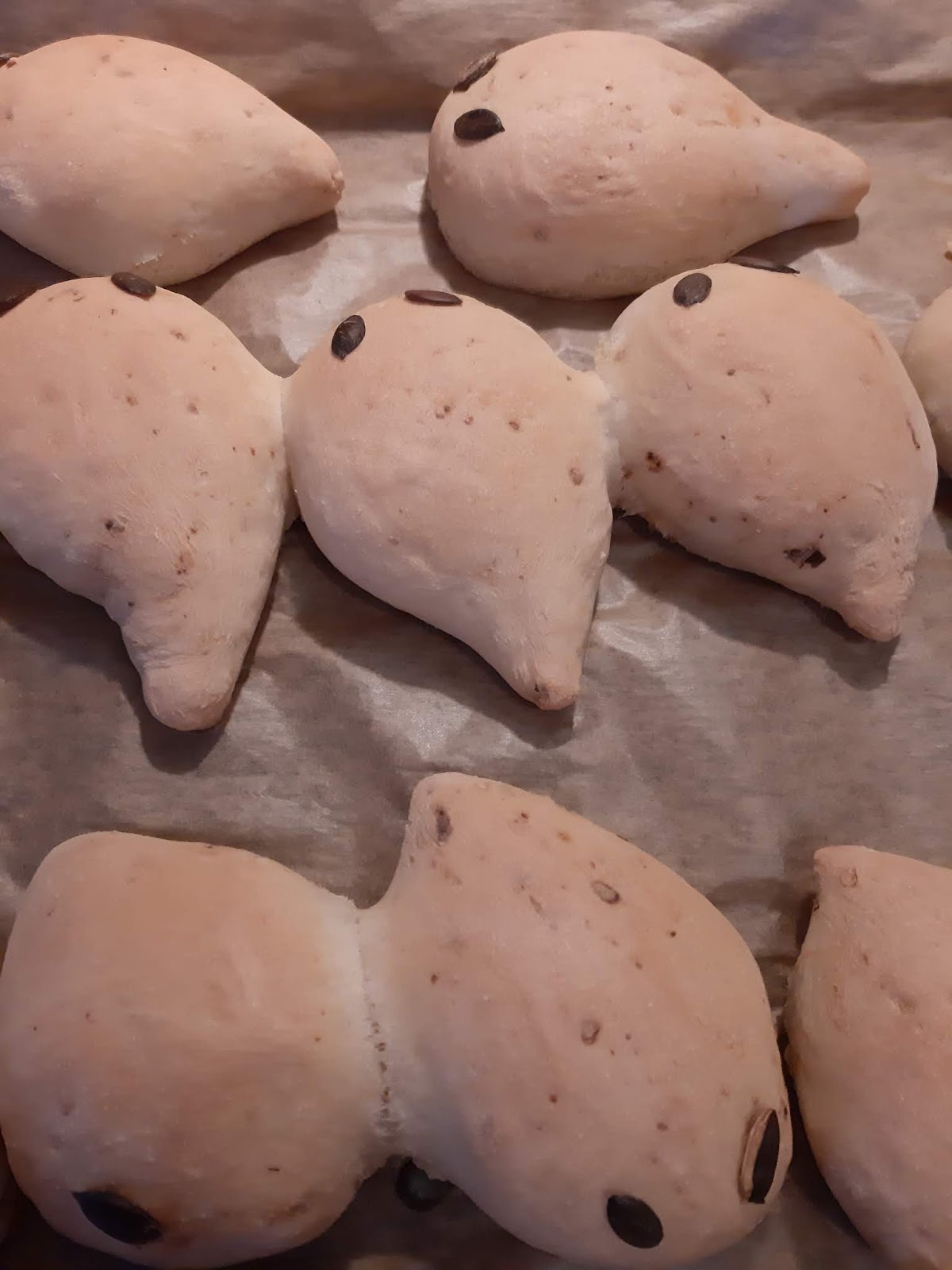 - Залепих тиквени семки за очи на дракончетата. С върха на ножица можете да клъцнете тестото за уши и по дължина на опашката за бодлите на дракона, но аз забравих 😂😂😂😂