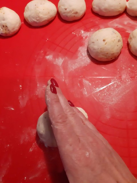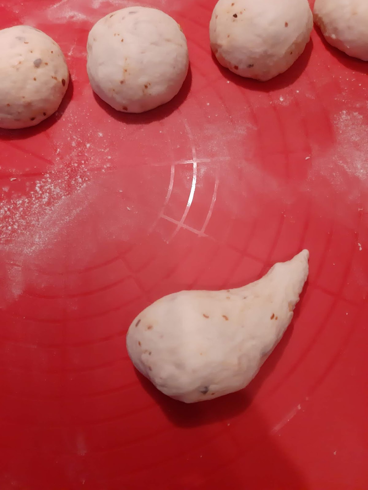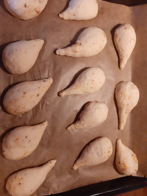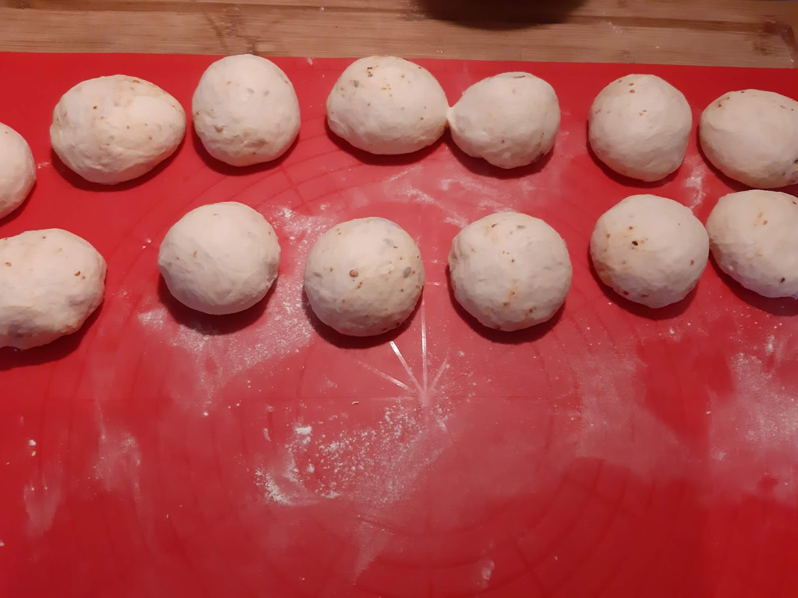 - Втасалото тесто разделих на парчета с грамаж около 70 гр, които оформих на гладки топки. В случая получих 13 бро, но може и по-малко да станат или повече. Всичко зависи от брашното, което използвате.