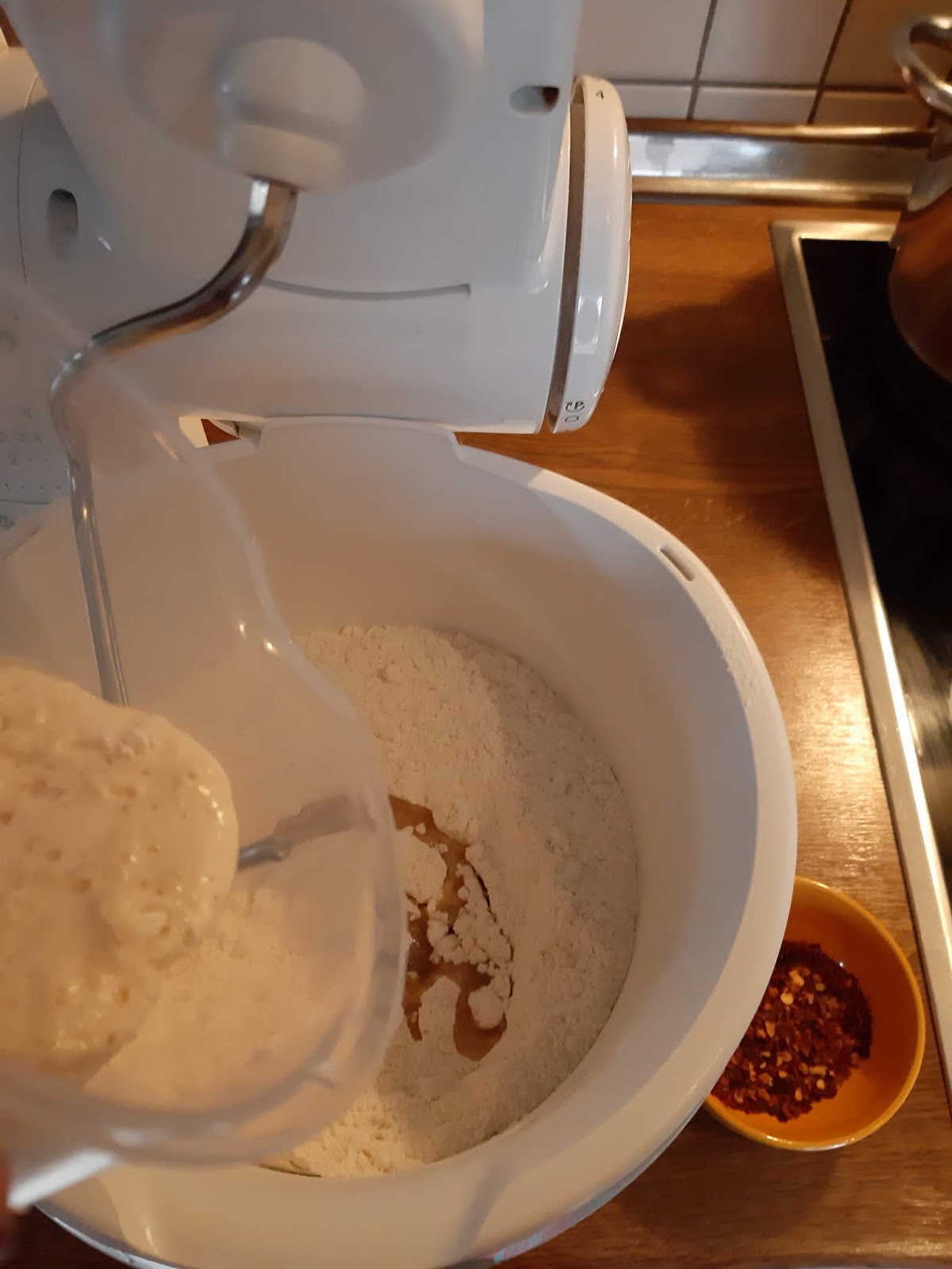 - В купата на миксера сипах около 400 гр от брашното, солта и олиото.