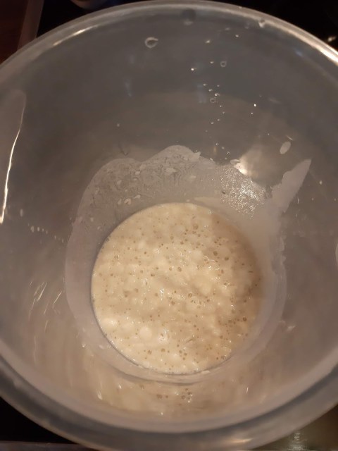 - В 100 мл от водата разтворих маята с щипка захар и малко от брашното. За около 5 минути маята се активира.
