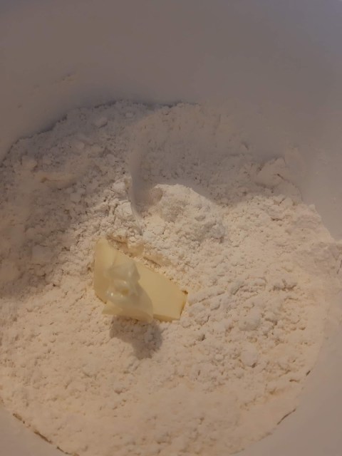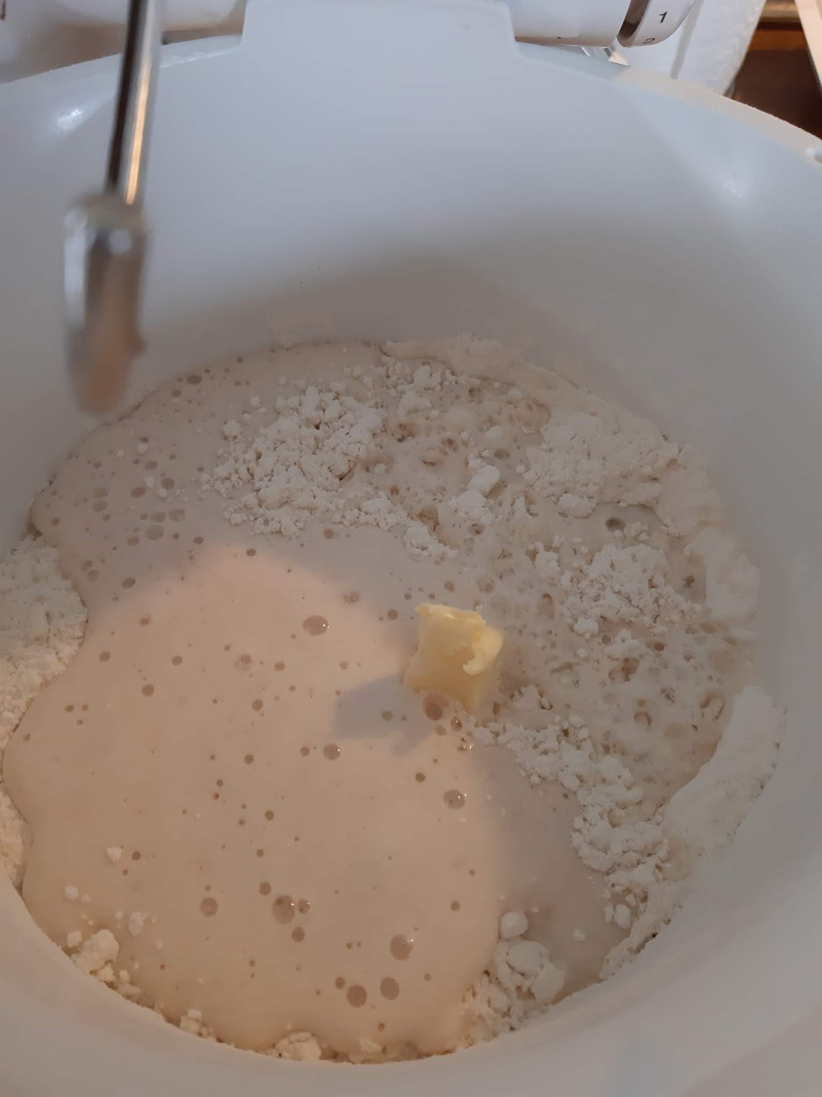 - Измервам в купата на миксера 400 гр брашно (предпочитам да добавям брашно, отколкото да ми стане твърдо тесото)