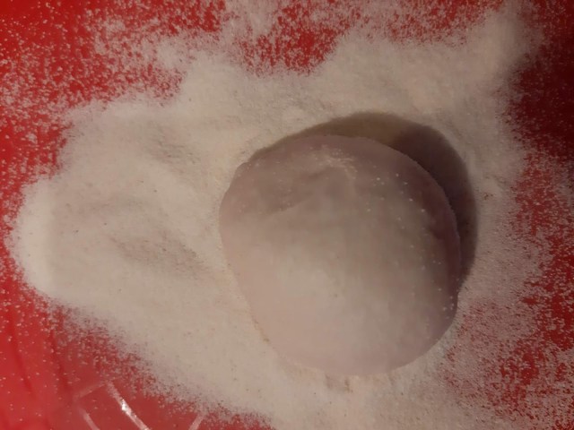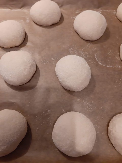 - От втасалото тесто късам парчета с грамаж около 70 грама, които върху поръсена с грис плоскост оформям на хубави топчета.