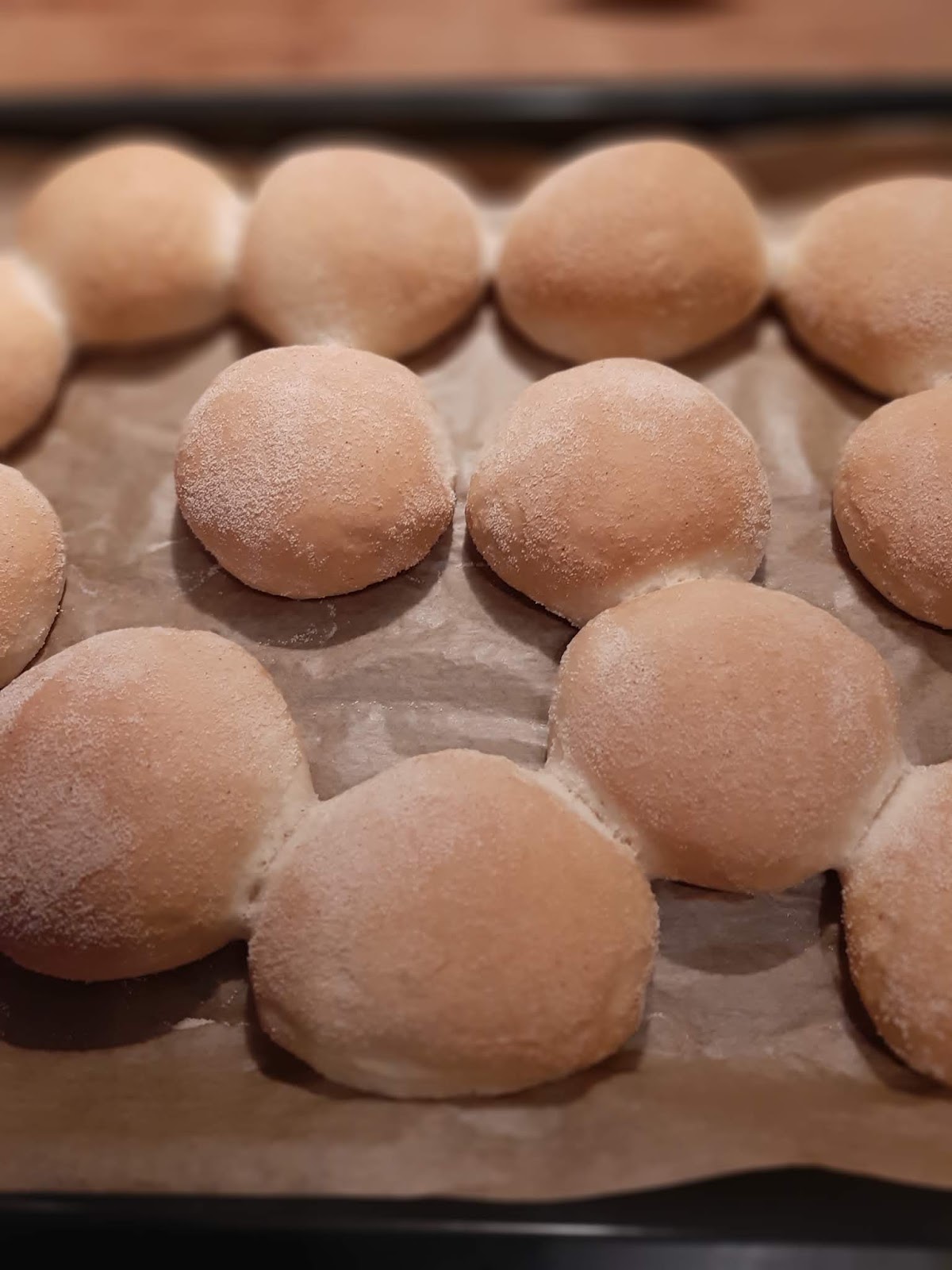 Освен, че има грис в тестото, което ги прави много въздушни, самите те са оваляни в грис. Той се запича по вереме на печенето и се получава точно тази хрупкавост и аромат на препечен грис.