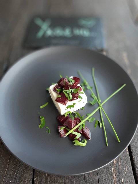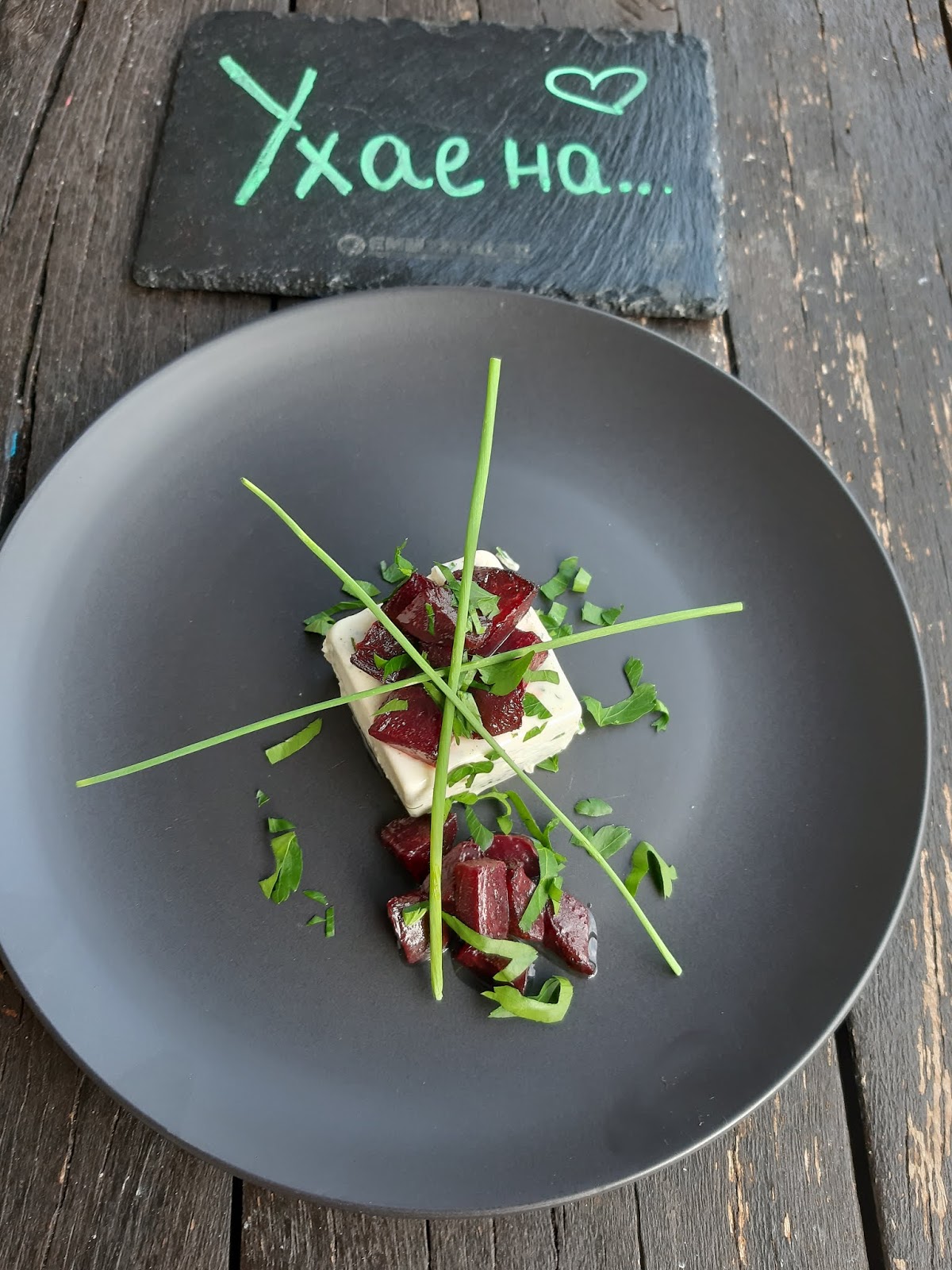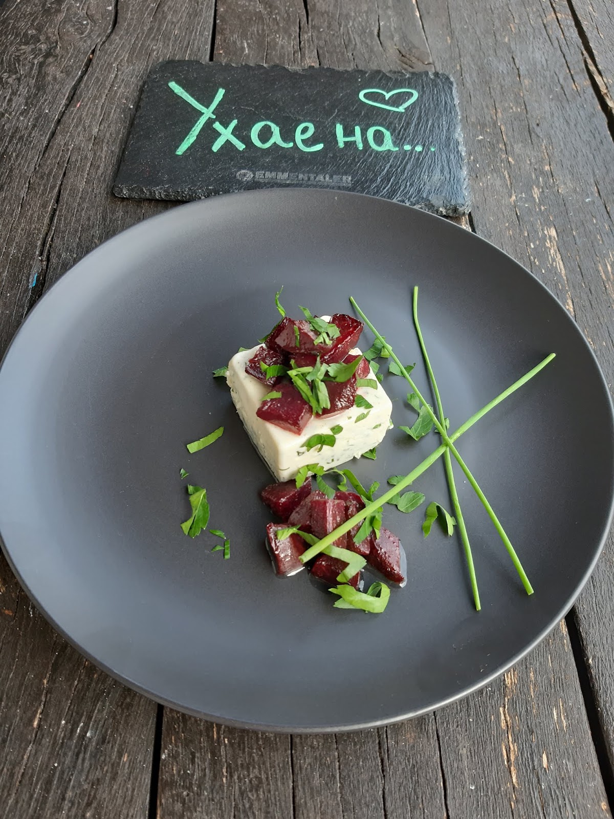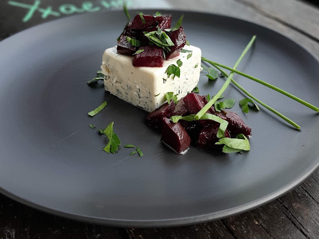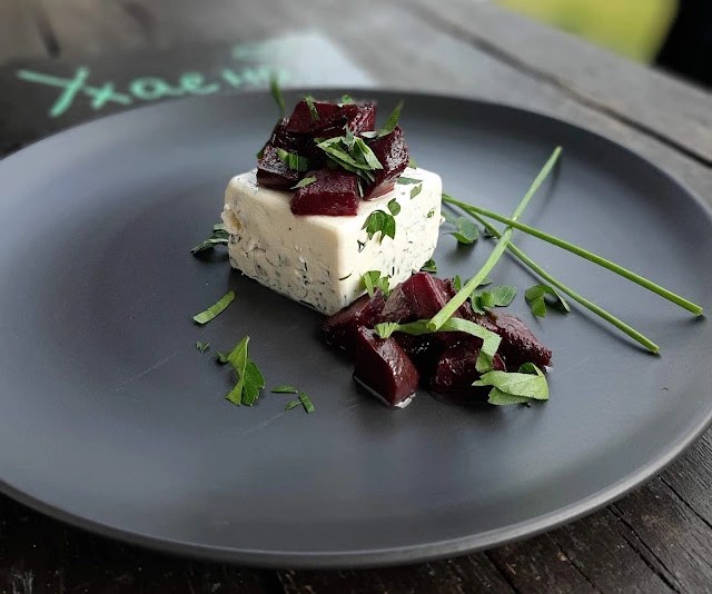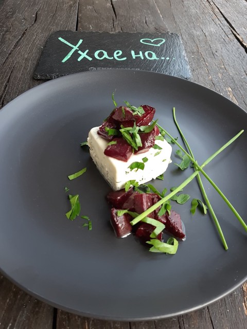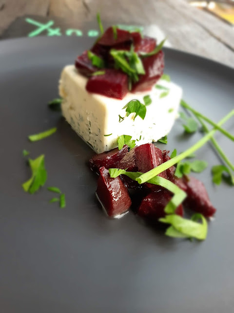 - Добре стегналата панакота извадих внимателно и декорирах с цвекло и зеленийки.