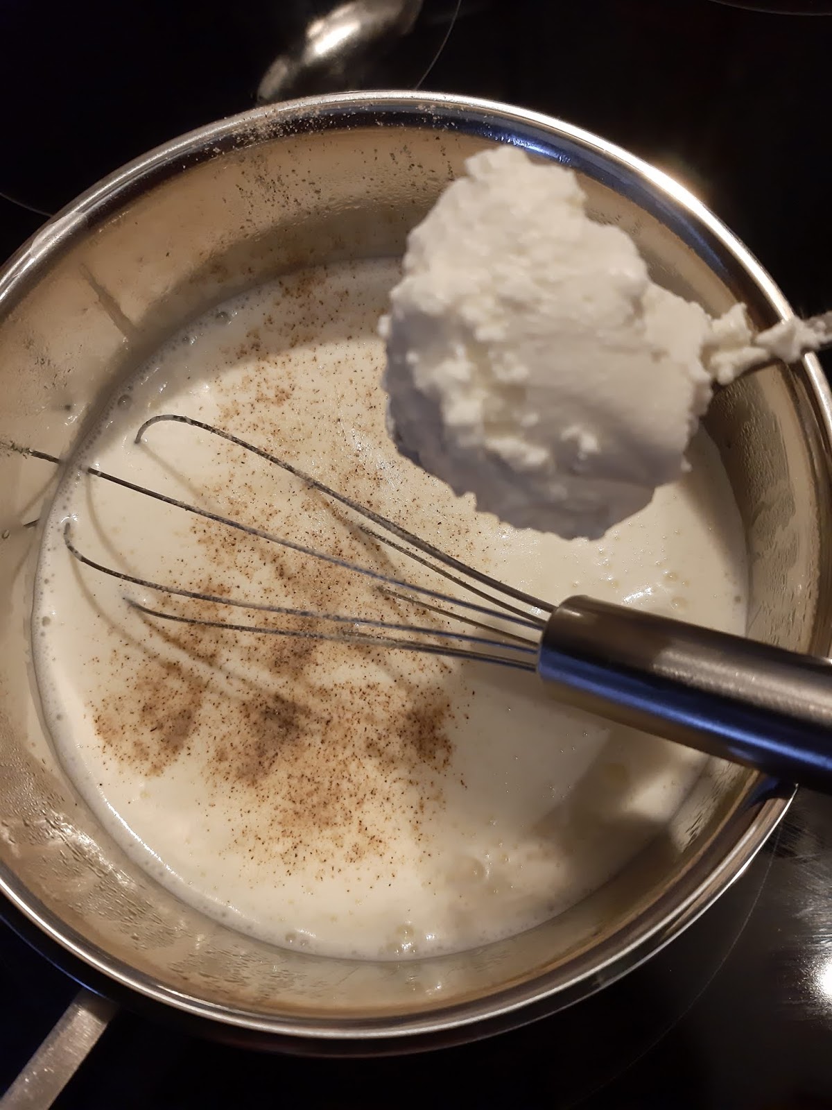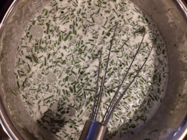 - Добавям към топлата сметана и заквасената сметан.