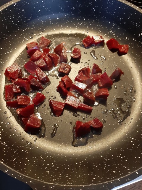 - През това време свареното цвекло нарязах на кубчета и изпържих за кратко в мазнина.