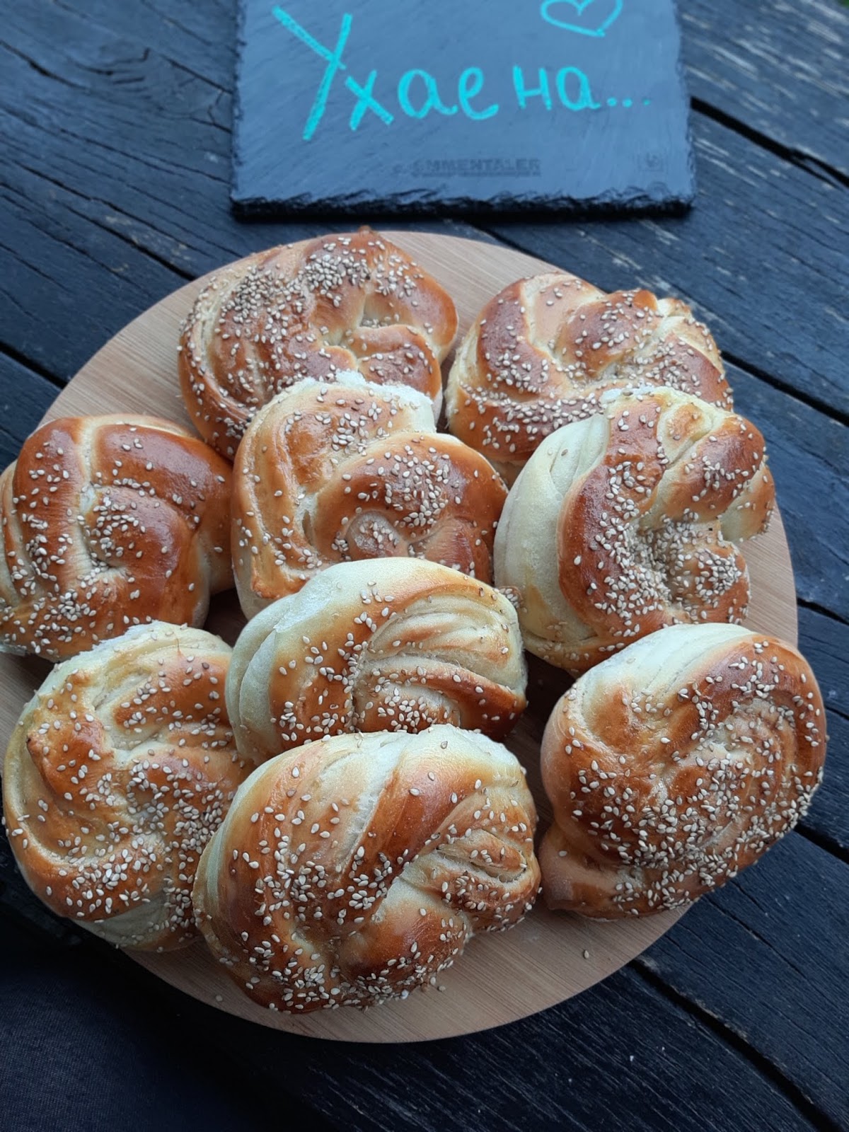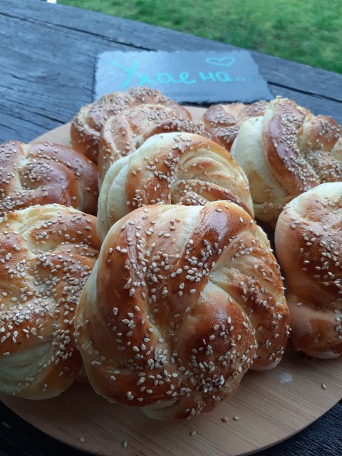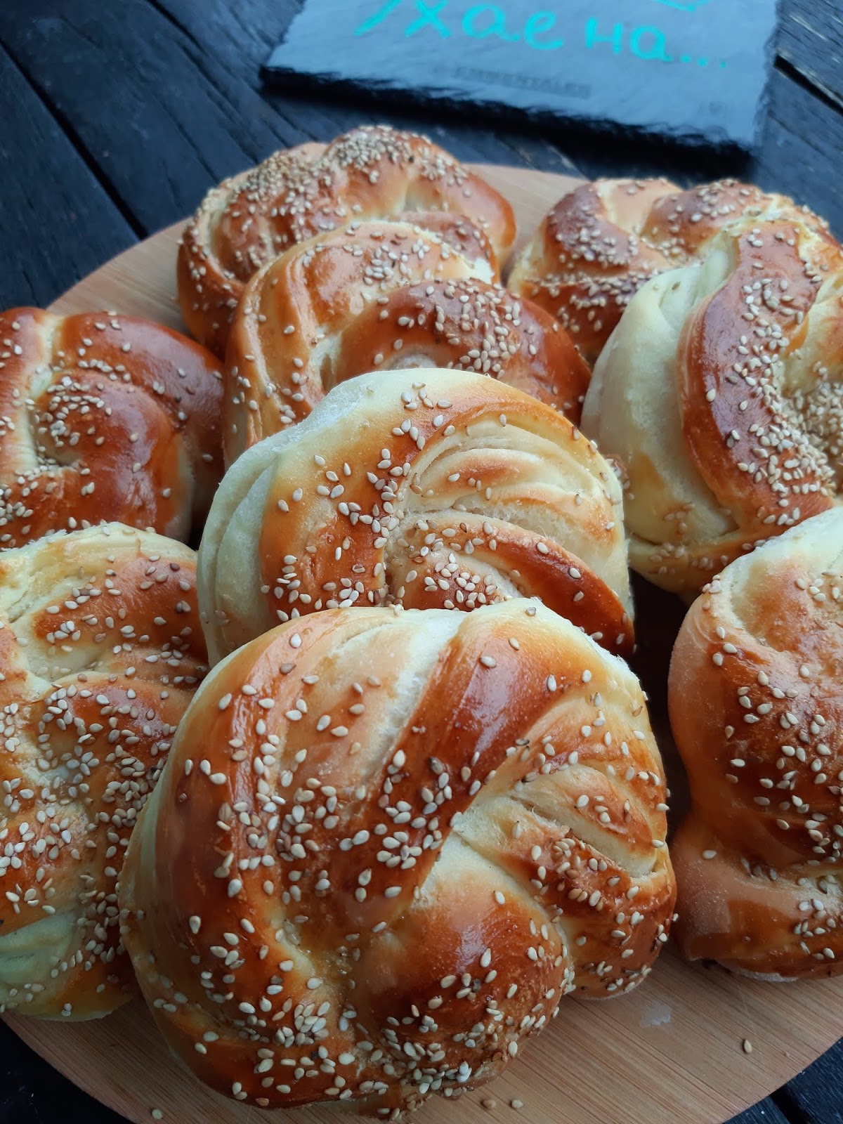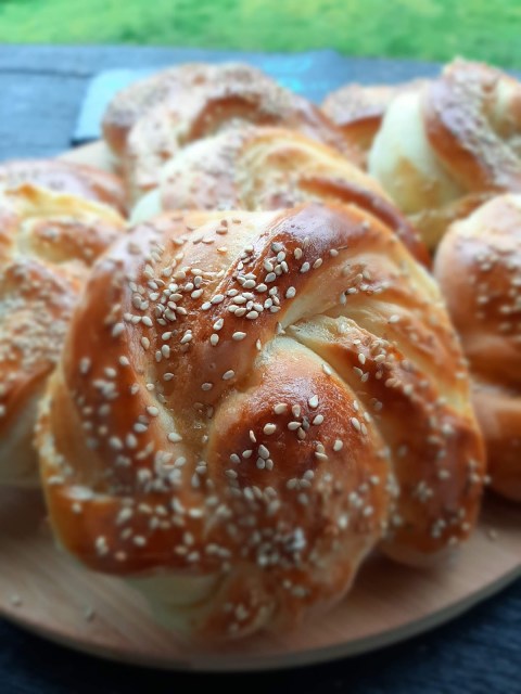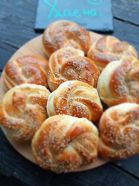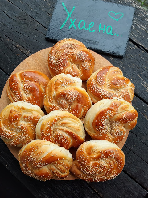 - След второто нмазване, поръсвам обилно със сусам и включвам фурната да загрее до 230 градуса и без вентилатор.