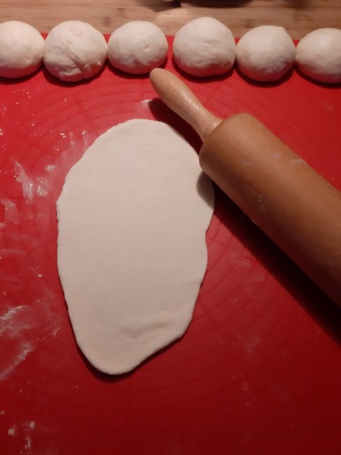 - Изчаках около 7 – 8 минути тестото да се отпусне и на поръсена с брашно плоскост започнах всяка питка да разточвам на елипса.