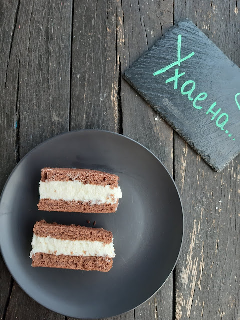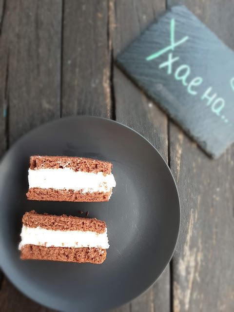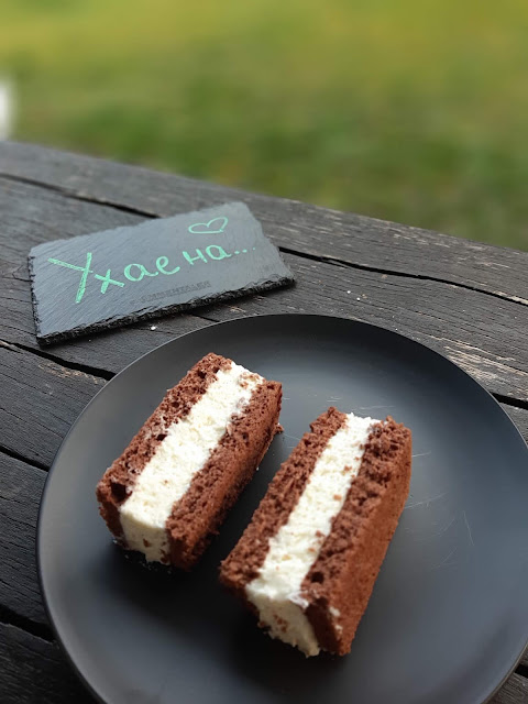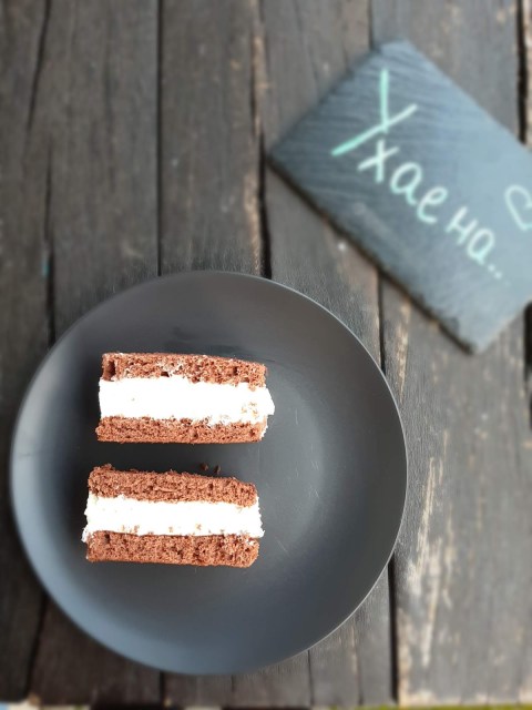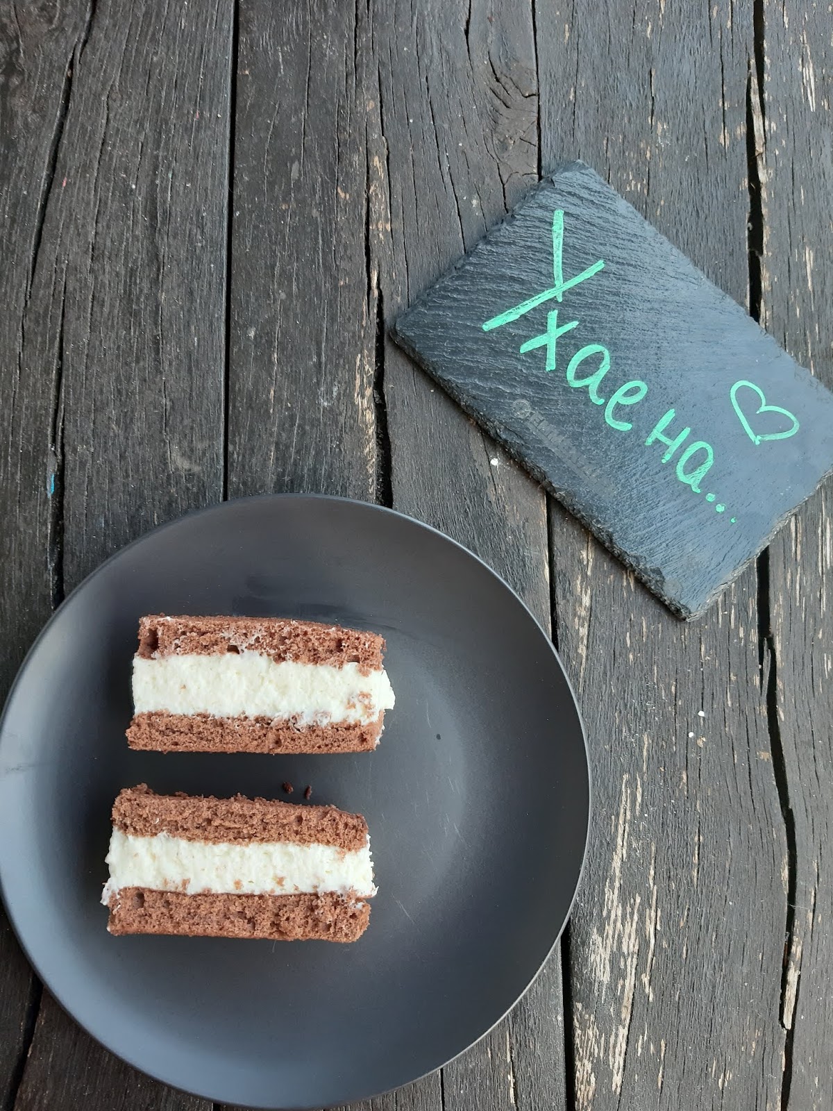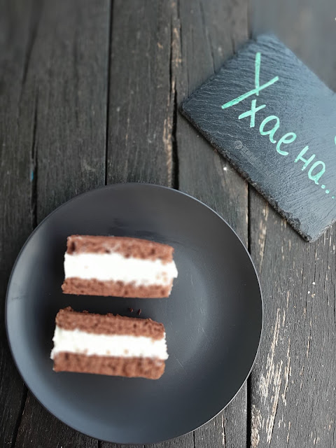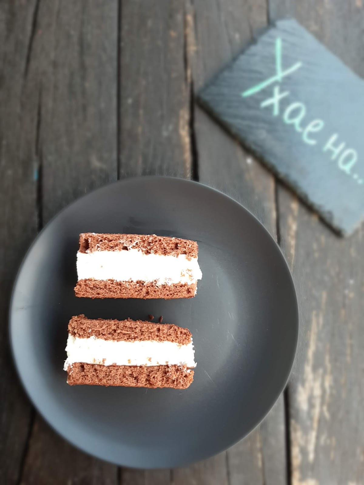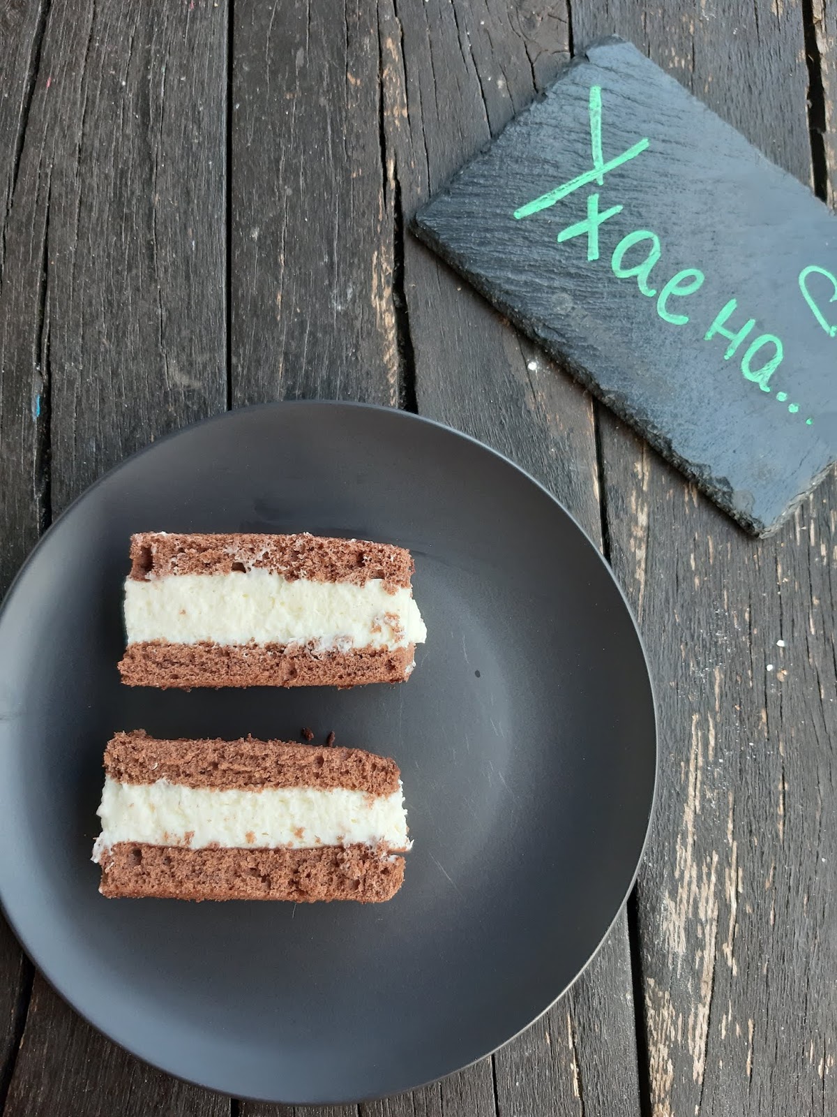 Между тънки филии какаов пандишпан има пухкав млечен крем.