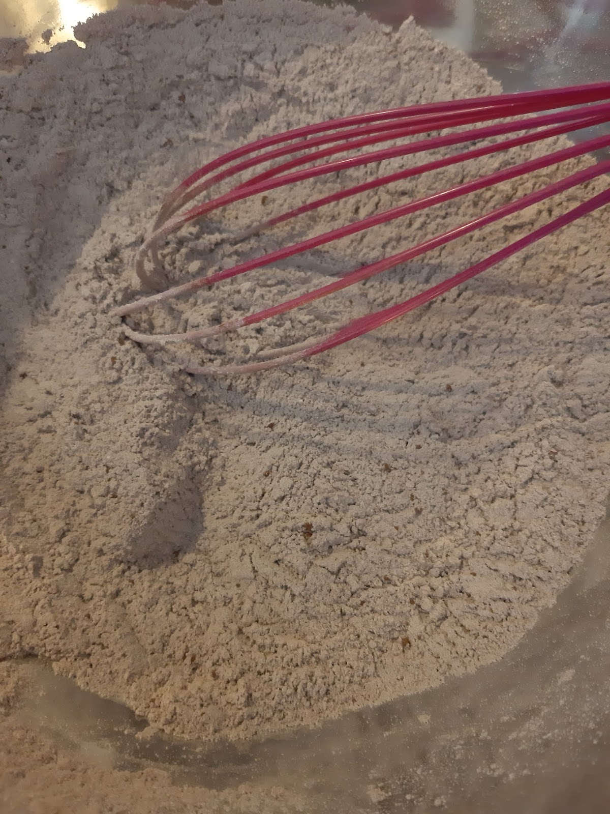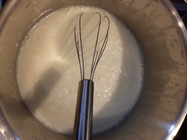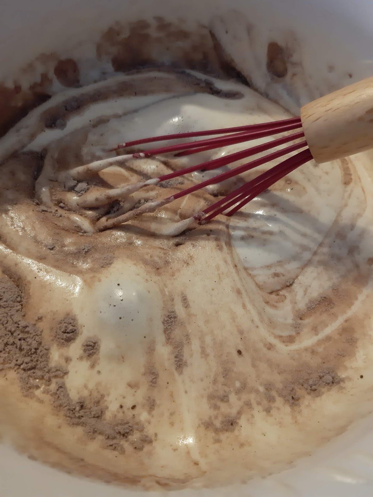 • Млякото смесвам със захарта и добавям сухите съставки. Разбивам с тел, докато всичко се разтвори. Може и ръчен миксер да използвате, ако искате.