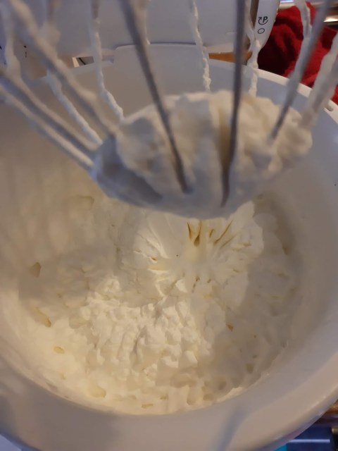 • Охладената добре сметана разбих до гъсто. Това разбирам по чертите, които оставя миксера в нея. Внимавайте, че много лесно се превръща в масло, ако я пребиете.