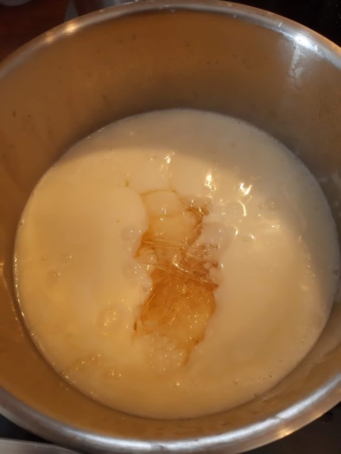• Сложих на котлона и варих на слаб котлон като не спирах да разбивам. Отнема време, защото така избягвам загарянето. Ако все пак Ви се случи да залепне за дъното на тенджерата, разбивайте без да докосвате дъното, за да не попаднат загорели парчета в млякото.