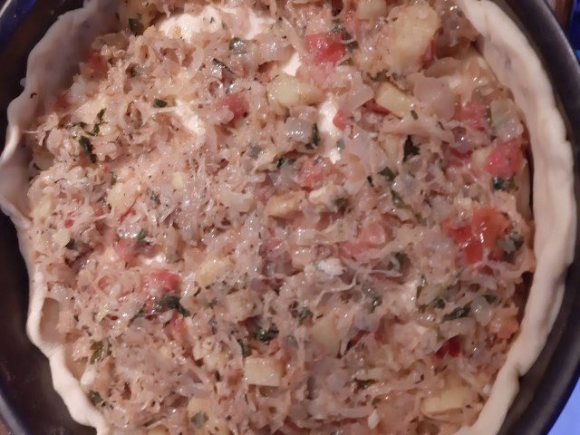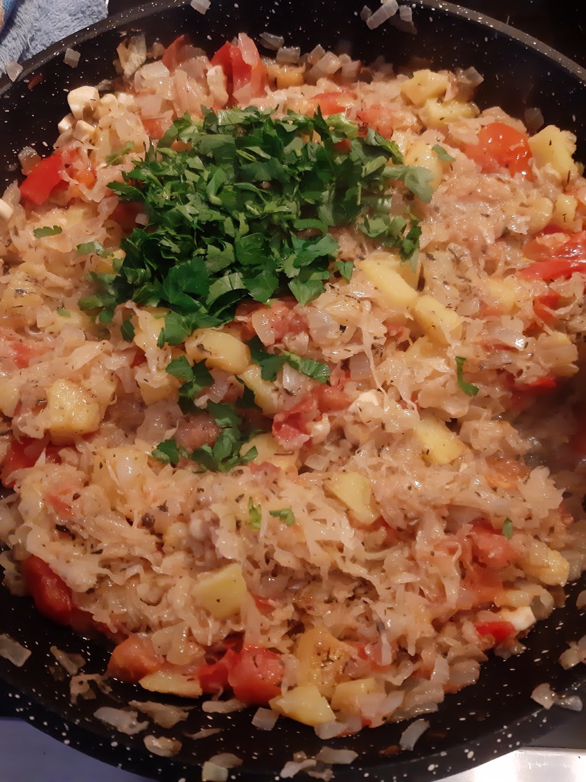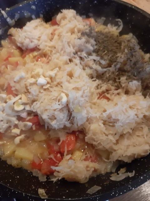 - След пет минути добавих нарязаното на много ситно и изтискано от излишната течност кисело зеле. Аз използвах немско кисело зеле, защото моето свърши. Продава се във всеки немски магазин.