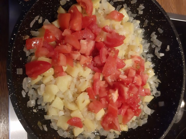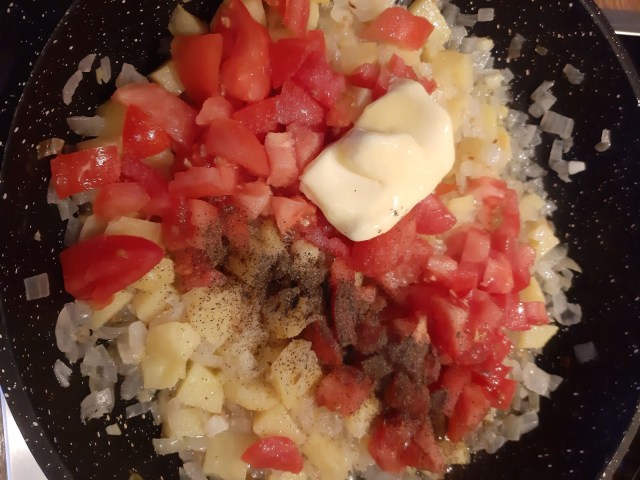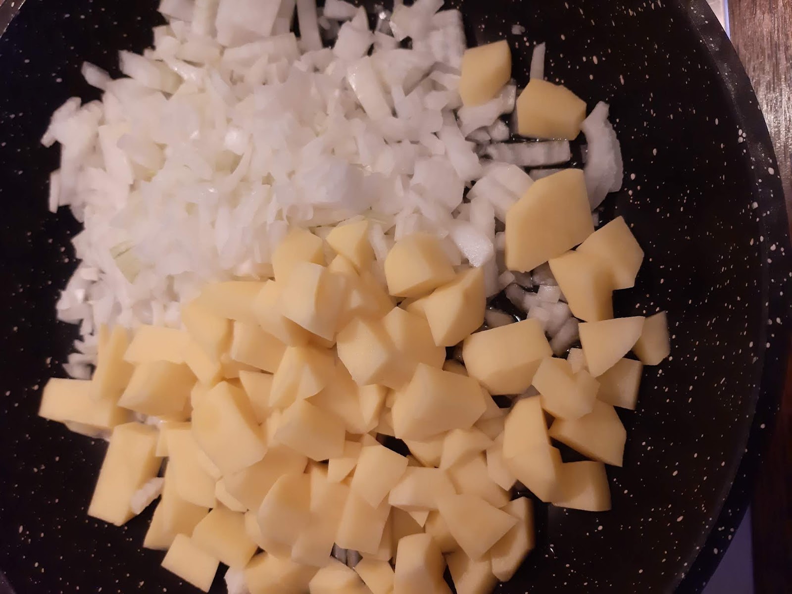 - За целта в тиган сипах олиото и задуших на слаб котлон и под капак за около 10 минути и до пълна готовност, нарязаните на кубчета кромид лук и картофи.