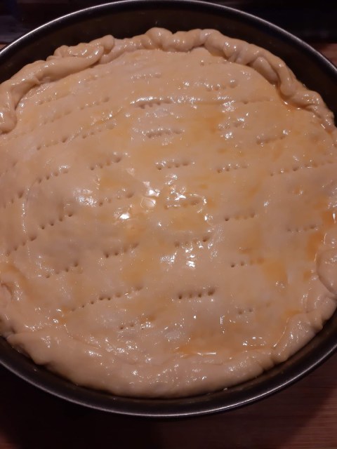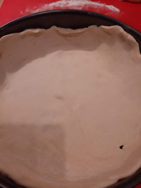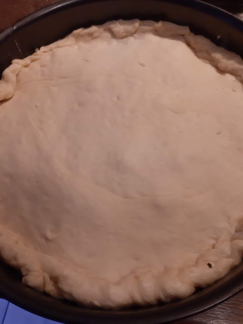 - Сложих първата кора и повдигнах леко по ръбовете на формата.