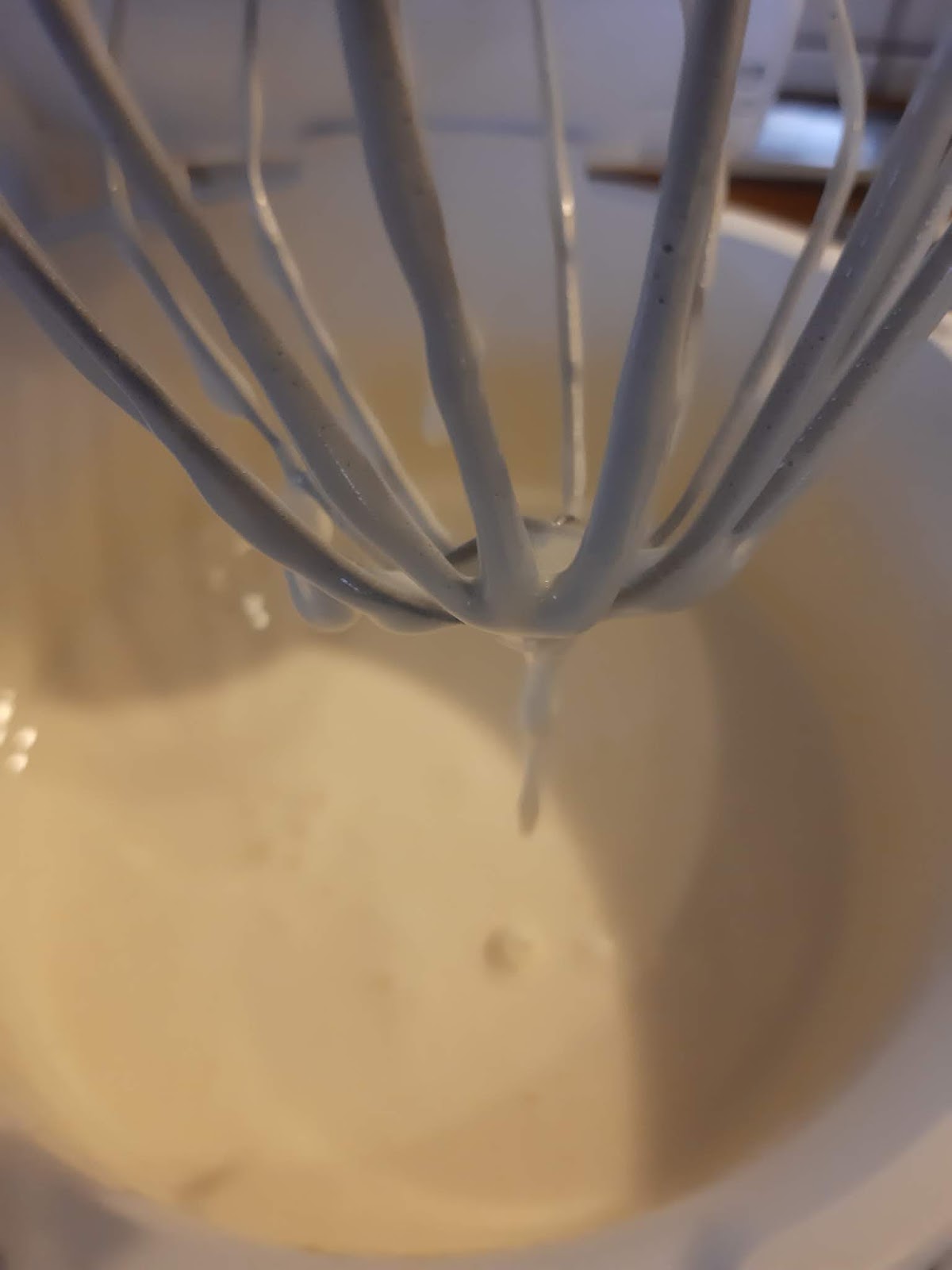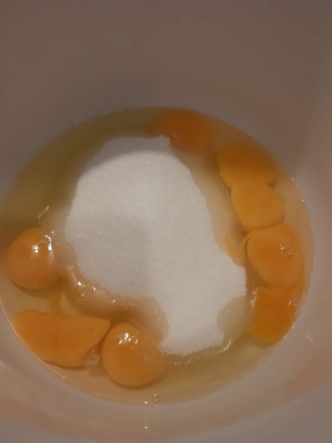 • В купата на миксера чуквам яйцата, добаввям захарта и солта и разбивам с накрайник за крем поне 5 минути.