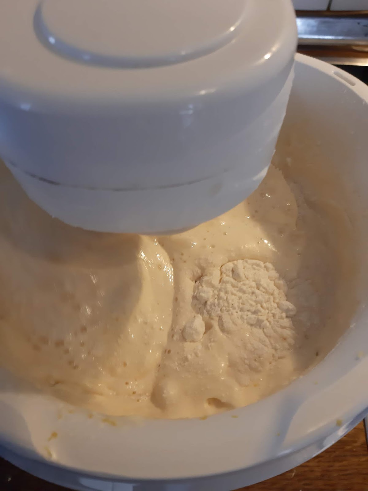 • Към края на разбиването добавям лимоновата кора, ванилията, а аз добавих и ампула с аромат на масло и ванилия.