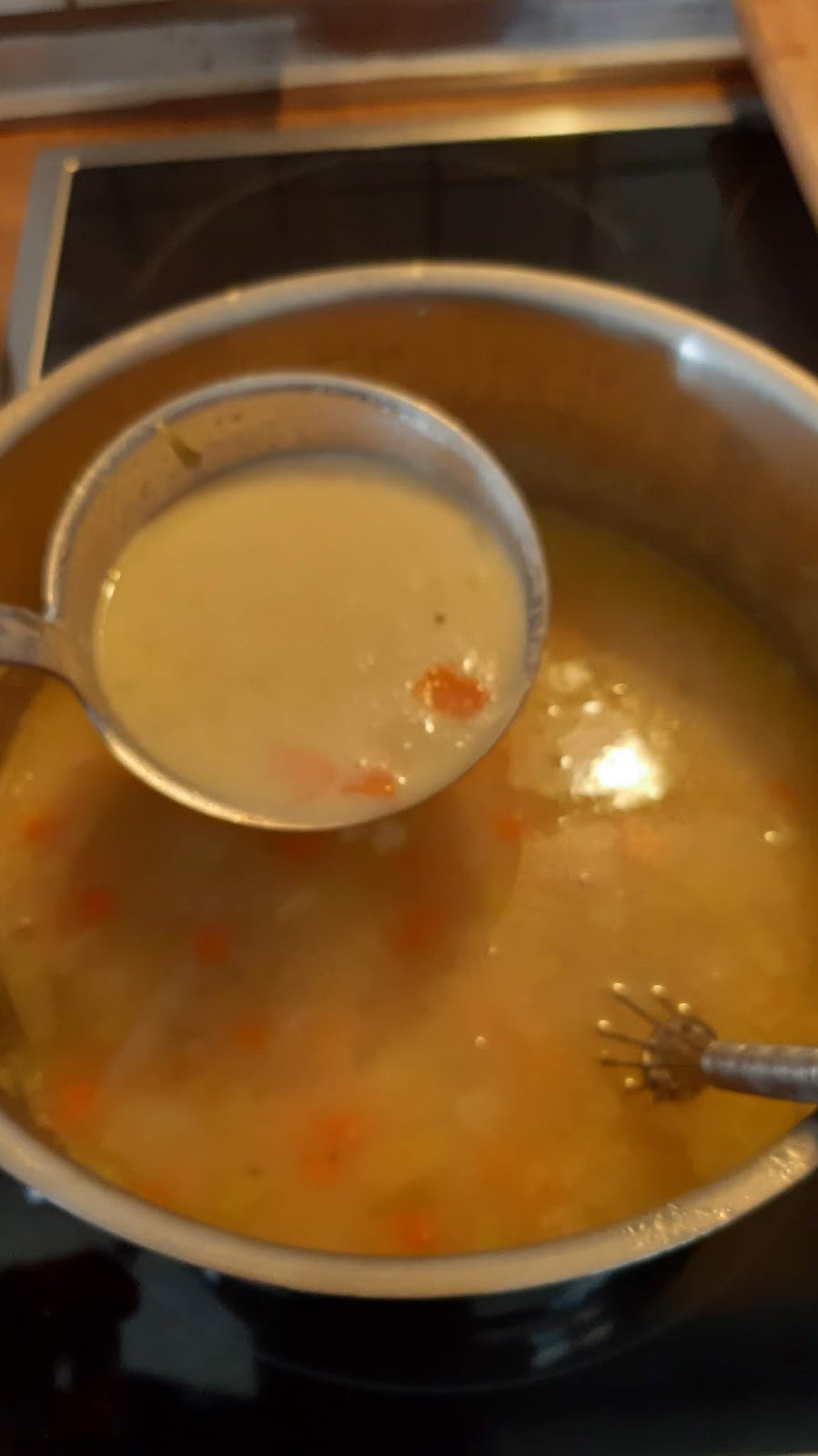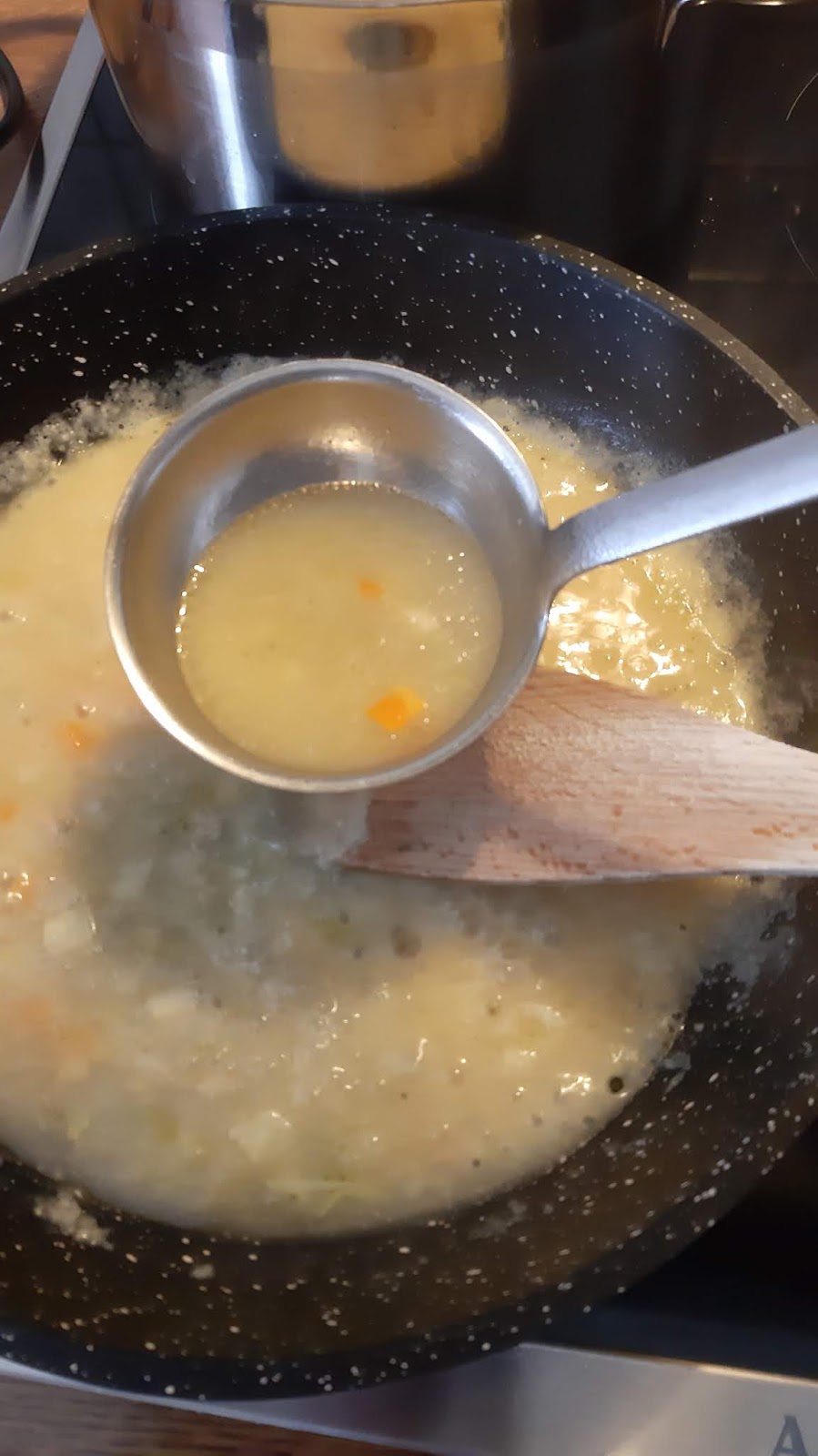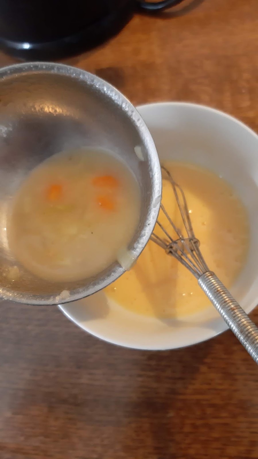 - Застройвам горещата супа като първо добавям от супата към яйцата, за да се уравновеси температурата.