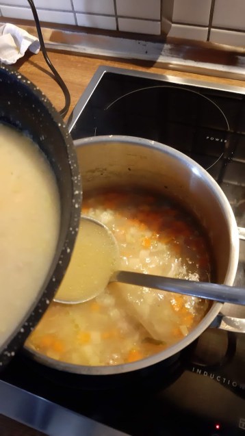 - Почистените и измити кости се варят на слаб котлон, залети със студена вода. Хубаво е да се препени бульонът. Писала съм много пъти в мои публикации как става. Аз лично си купувам готови бульони, без консерванти. В Германия се предлагат в буркани и в почти всички вериги магазини.