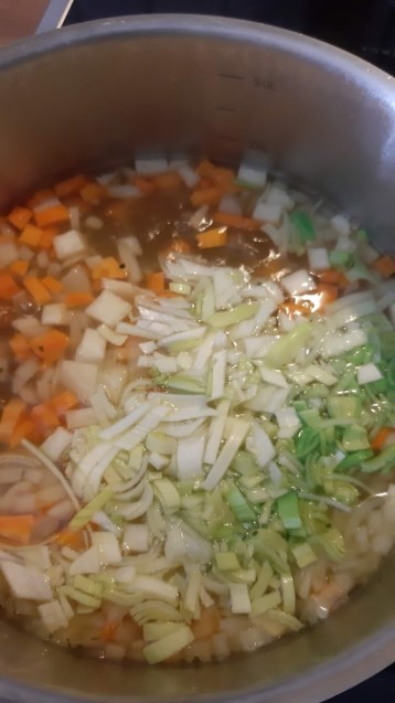 - Аз само слагам моя бульон 1,5 литра да заври и добавям зеленчуците.