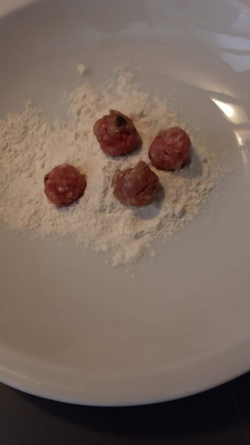 - Оваляните в брашно топченца добавям също към къкрещия бульон. Намалявам котлона максимално, за да не ми се раздробят топченцата.