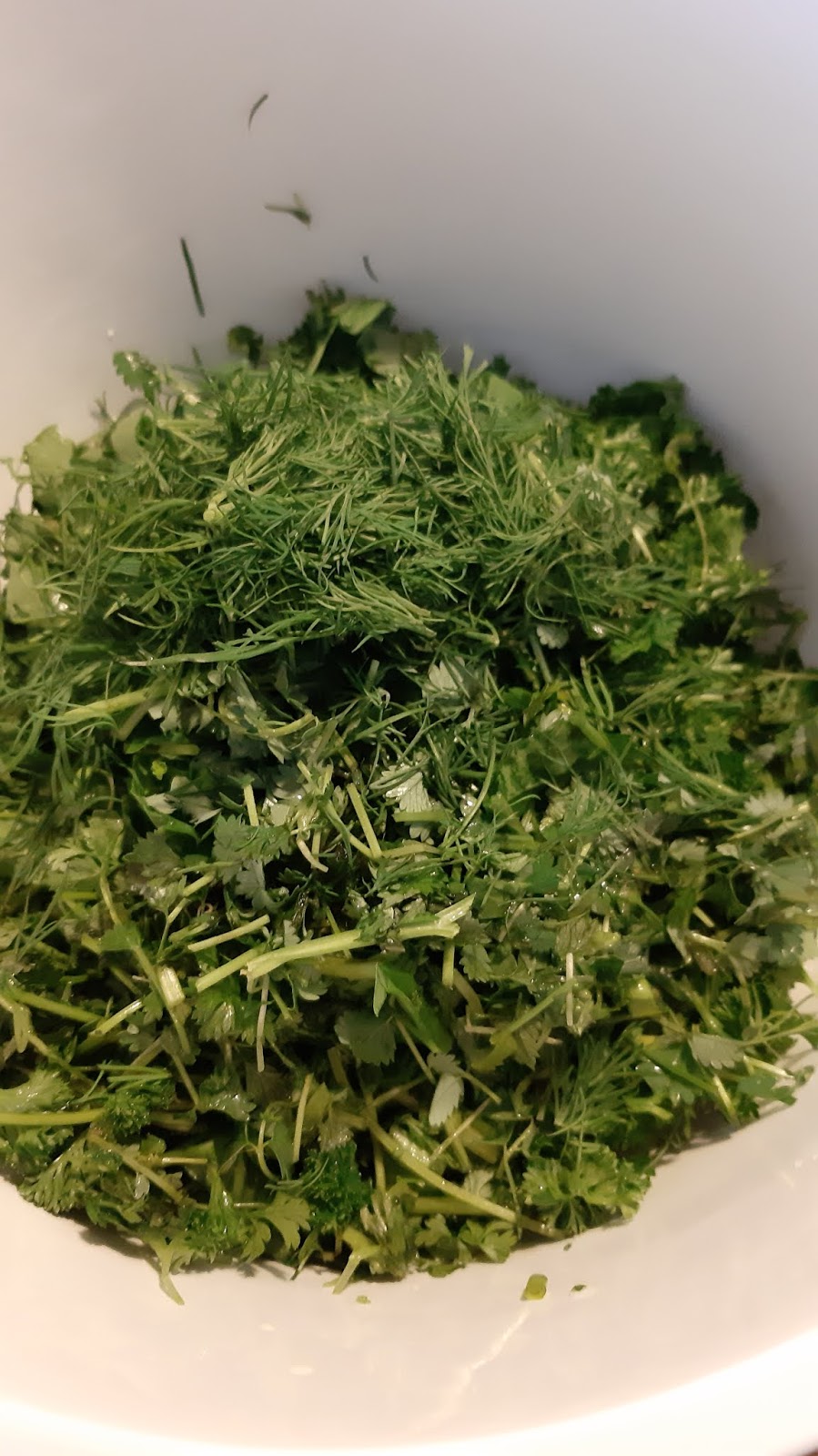 Билките накисвам в студена вода, послел отцеждам и нарязвам на ситно.