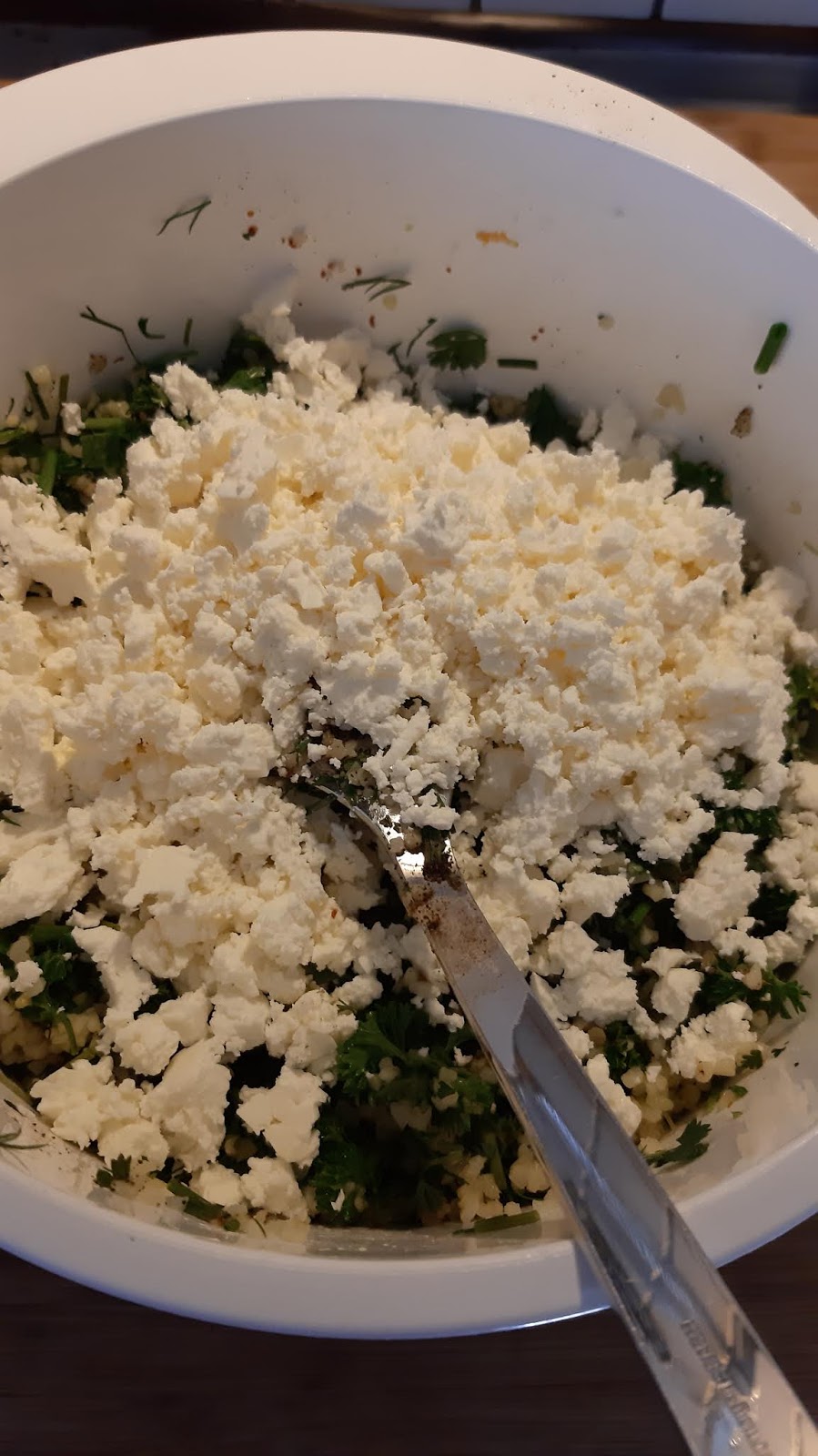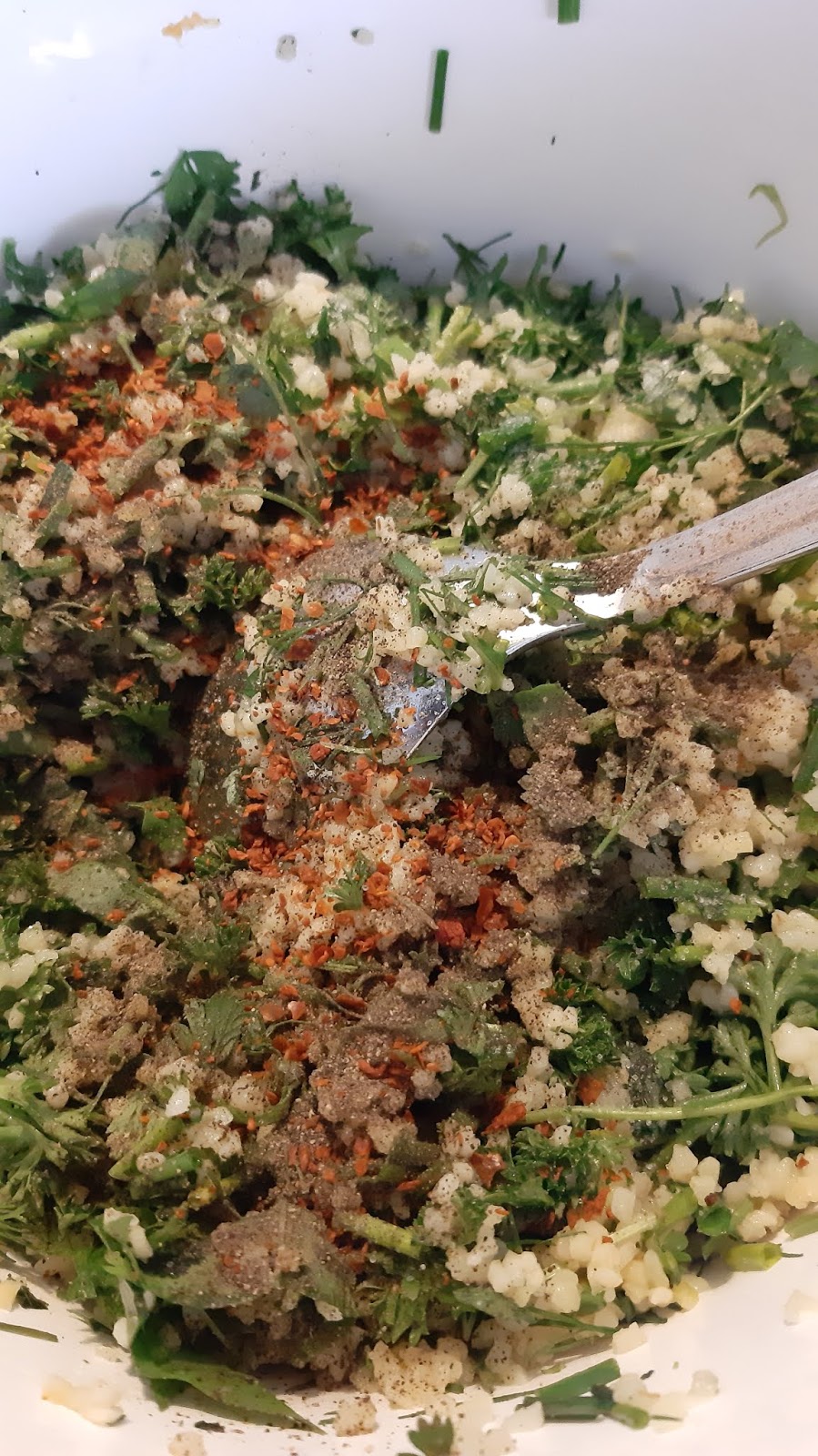 • В купа смесих охладения булгур със зеленийките и подправих по свой собствен вкус. В случая малко черен пипер, сол, лют червен пипер.