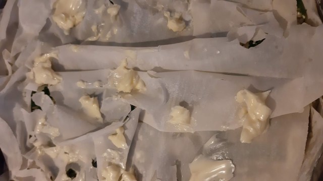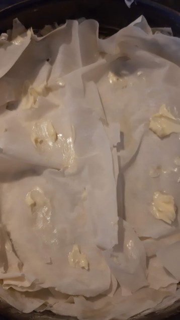 • Намазах  подходяща тавичка с маргарин и започнах да редя корите. На дъното сложих три броя, които мажех с меко масло.