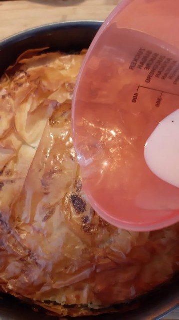 • Готовата баница вадя от фурната, заливам или по-точно напръсквам с прясното мляко и завивам хубаво с кърпа, за да се задуши.