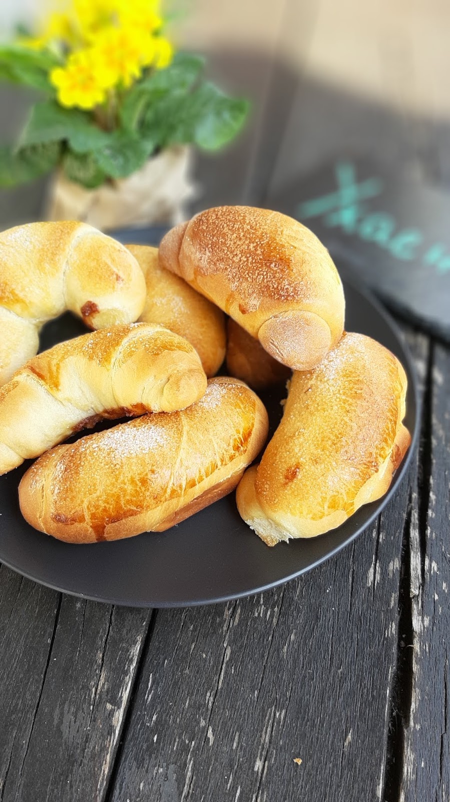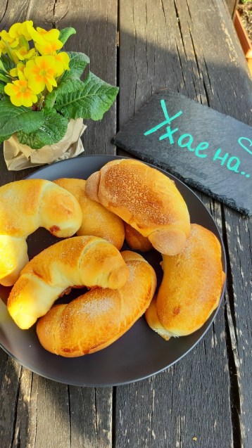 • Втасалите кифли намазвам с разбито яйце и поръсвам със захар.