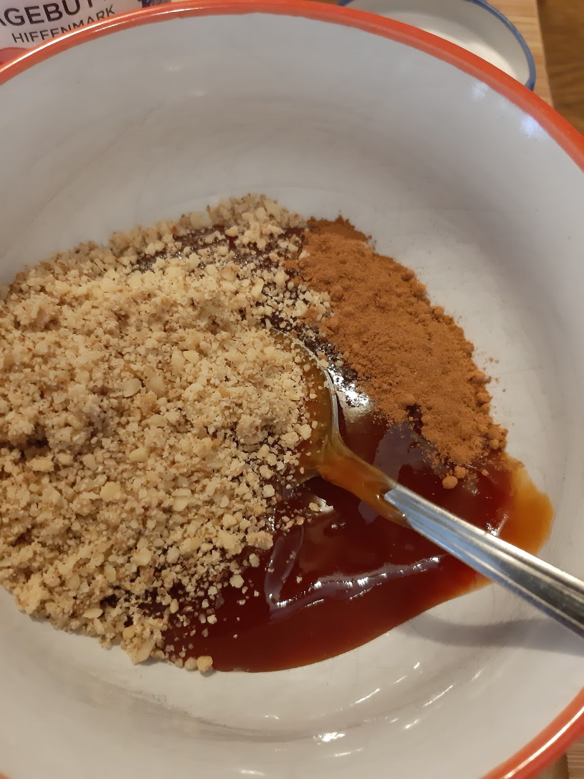 • Смесвам шипковия мармалад с орехите и аз добавям малко канела за аромат. Ако искате можете да я пропуснете.