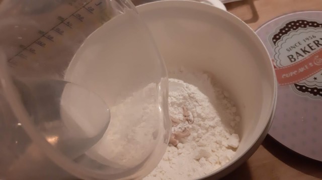 - Включих миксера с накрайник за тесто на първа степен и започнах да добавям топлата вода на струйка и да меся.
