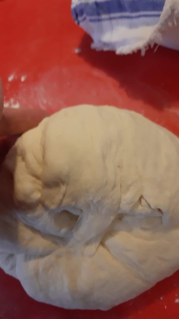 - Премесих върху набрашнена плоскост тестото и оформих на топка като подвивах краищата към средата, въртя на дясно, подвивам, въртя на дясно.