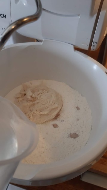 - Както и в увода написах, започнах с предварителното тесто вечерта, преди месенето на хлебчето.