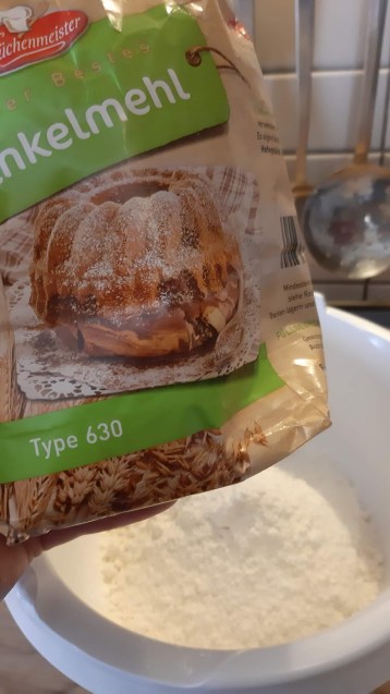 - На другия ден отмерих една част от нужното брашно в купата на миксера. Аз използвах ето тази спелта.