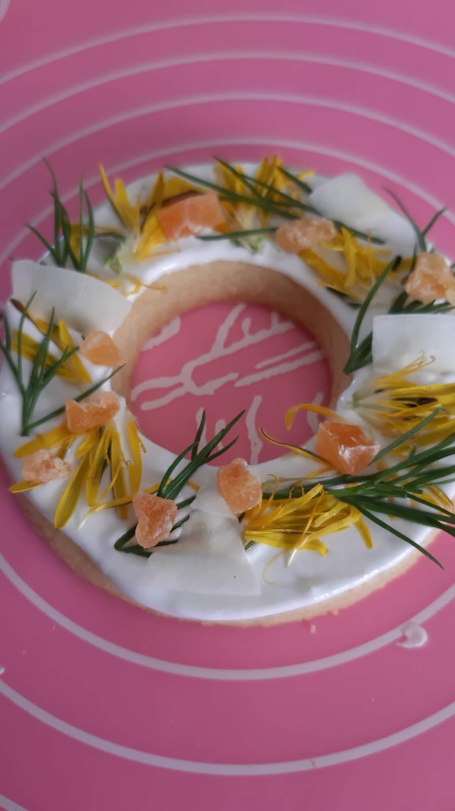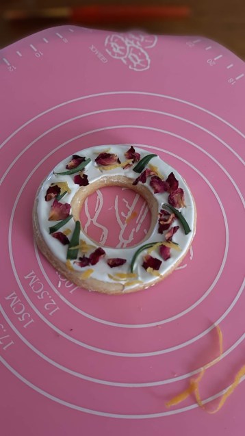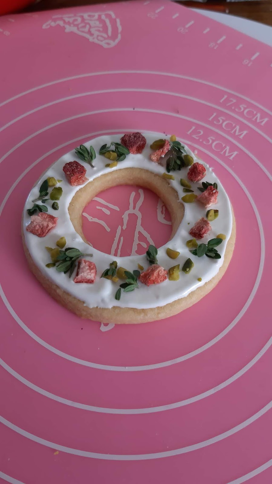 - С помощта на малка шпатула или нож намазвам глазура върху бисквитките. Не е нужно да е съвсем гладко, защото ще я покрием с цветя и плодове.