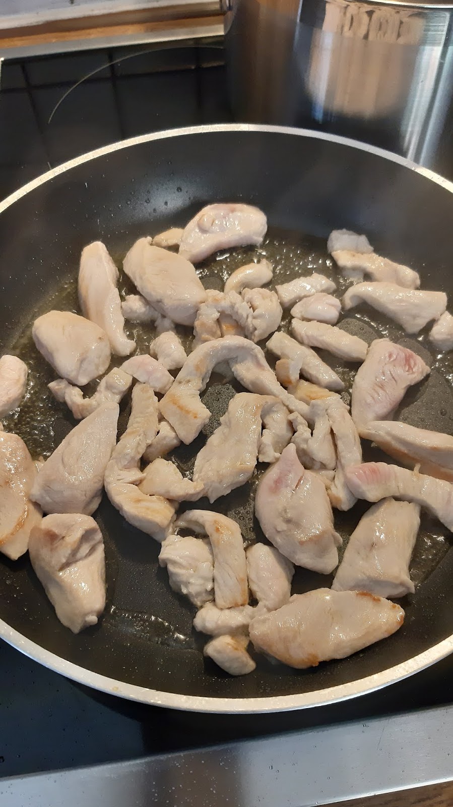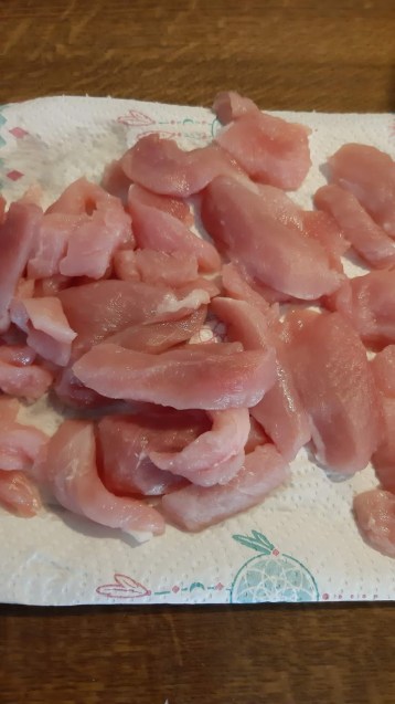 - Пуешкото месо измивам и много добре подсушавам. Ако е цяло месо, нарязвам на хапки.
