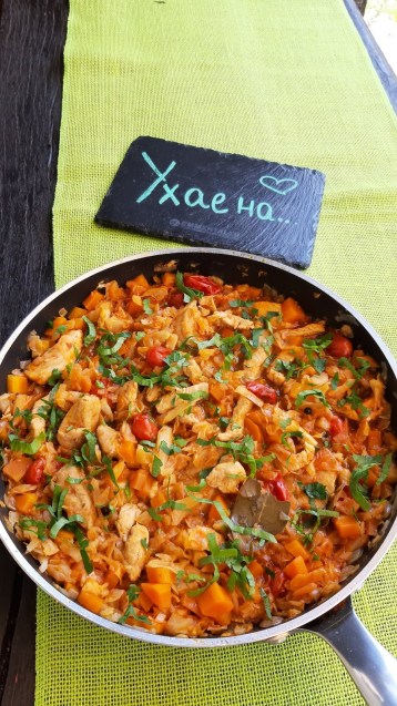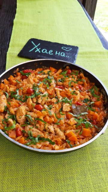 - Цялото ястие приготвих в голям и дълбок тиган, но може да използвате и плитка и широка тенджера.
