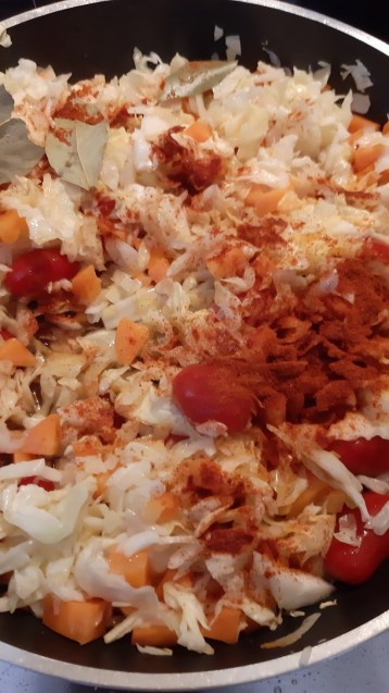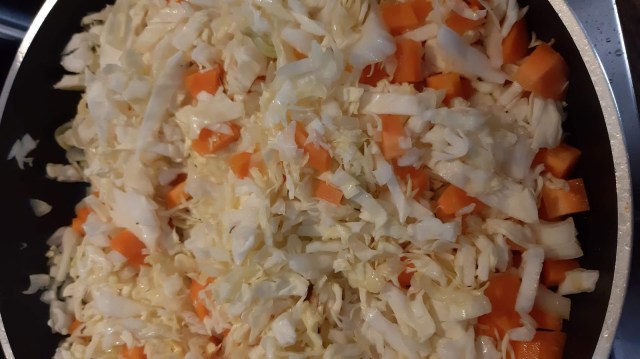 - В същата мазнина слагам зелето, нарязания на ситно кромид лук и нарязаните на кубчета моркови да се задушат под капак.