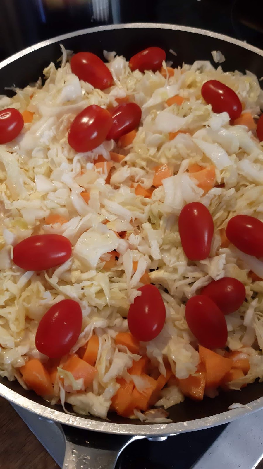 - Когато поомекнат зелето и морковите, добавям доматчетата.