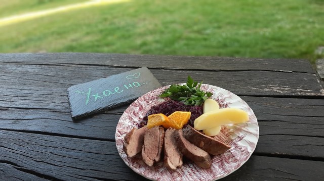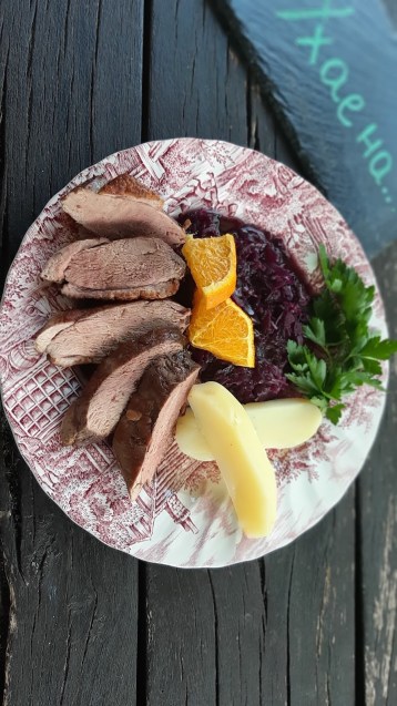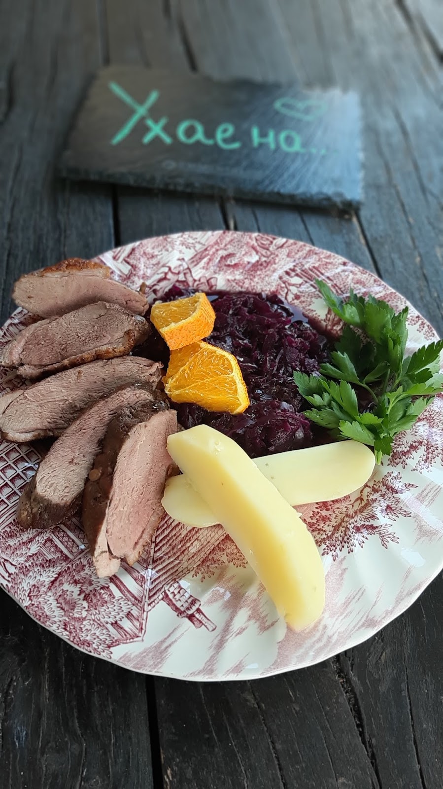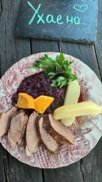- Сервирам патешките гърди нарязани и върху червено зеле, с варени картофи.