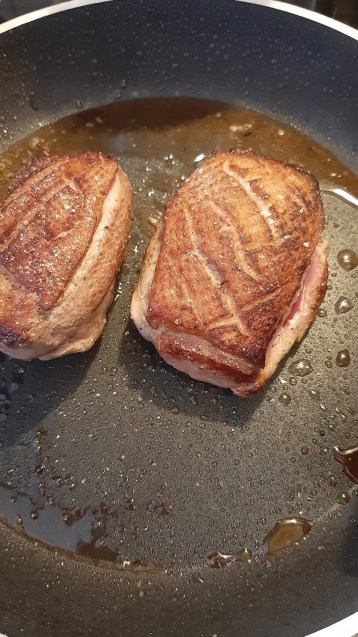 - Слагам патешките гърди в сух тиган с кожата надолу.