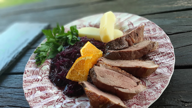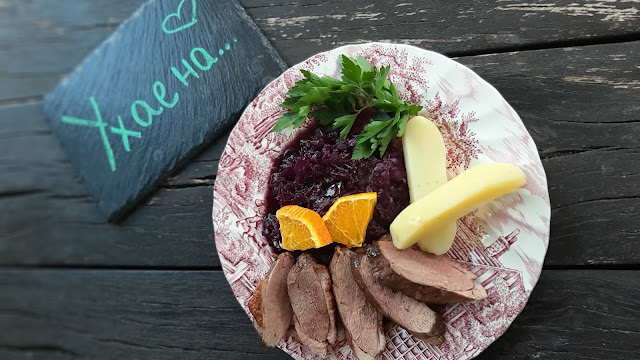 Аз сервира моите патешки гърди с типичното за Германия червено зеле с ябълки и варени картофи. Портокалчето завършва вкуса!