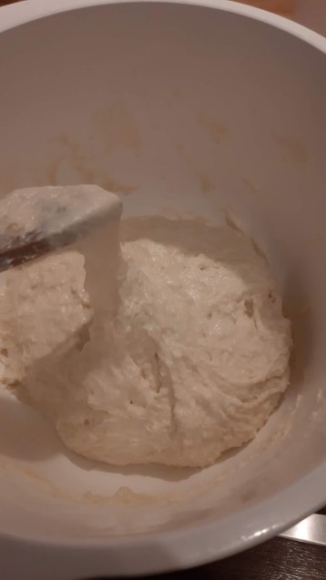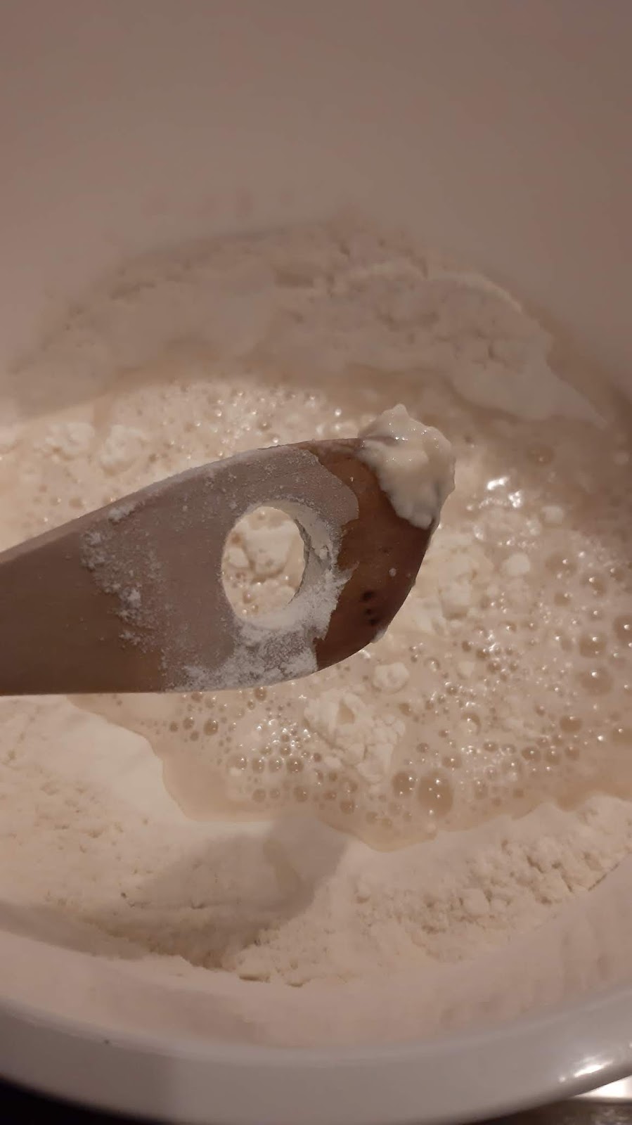 Лесно е! Смесвате всичко в една купа, бъркате с лъжица и … „забравяте“ за 18 часа. После само сгъвате и печете! Това е!