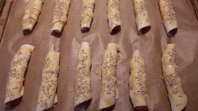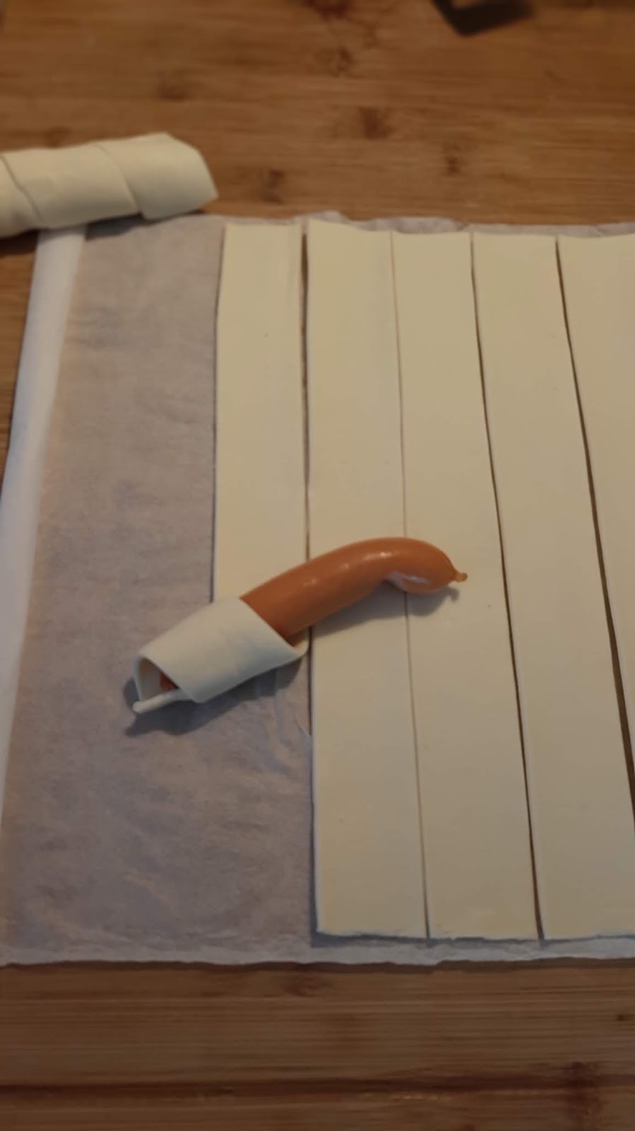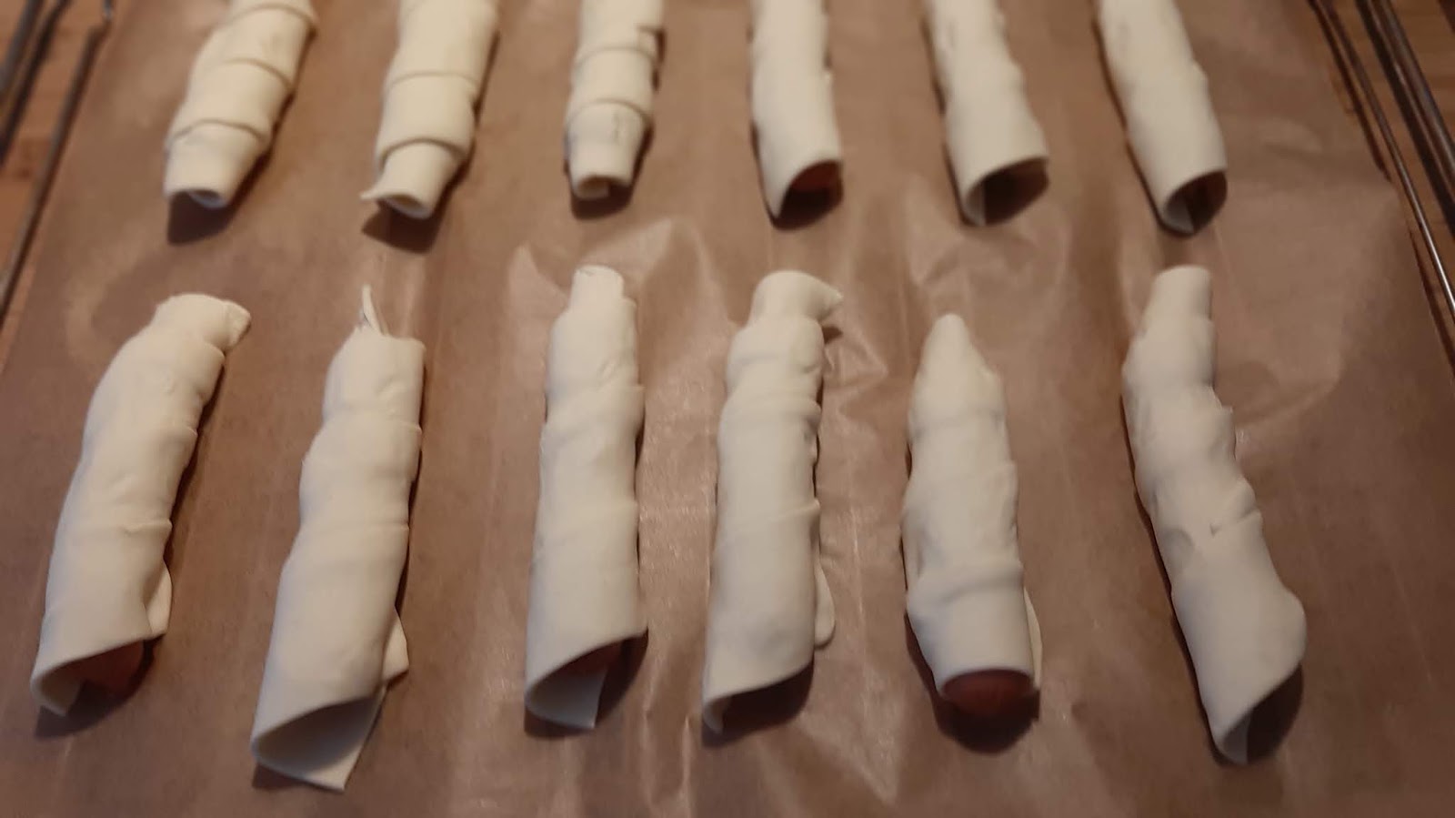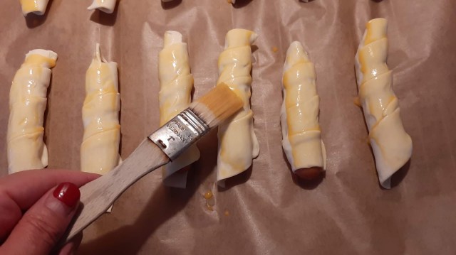 - Около всеки кренвирш навивам лента тесто като леко застъпвам.