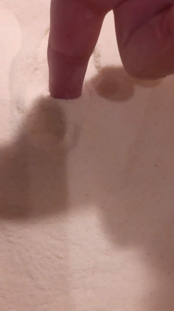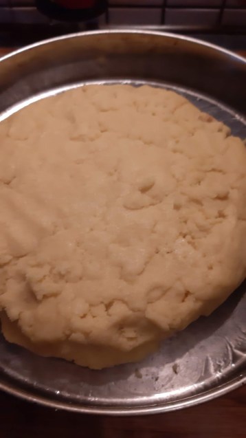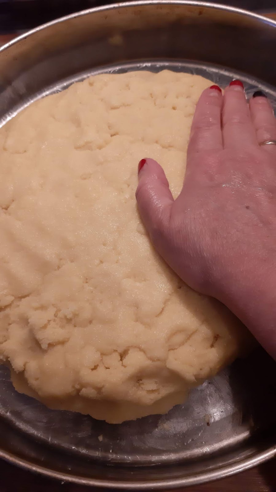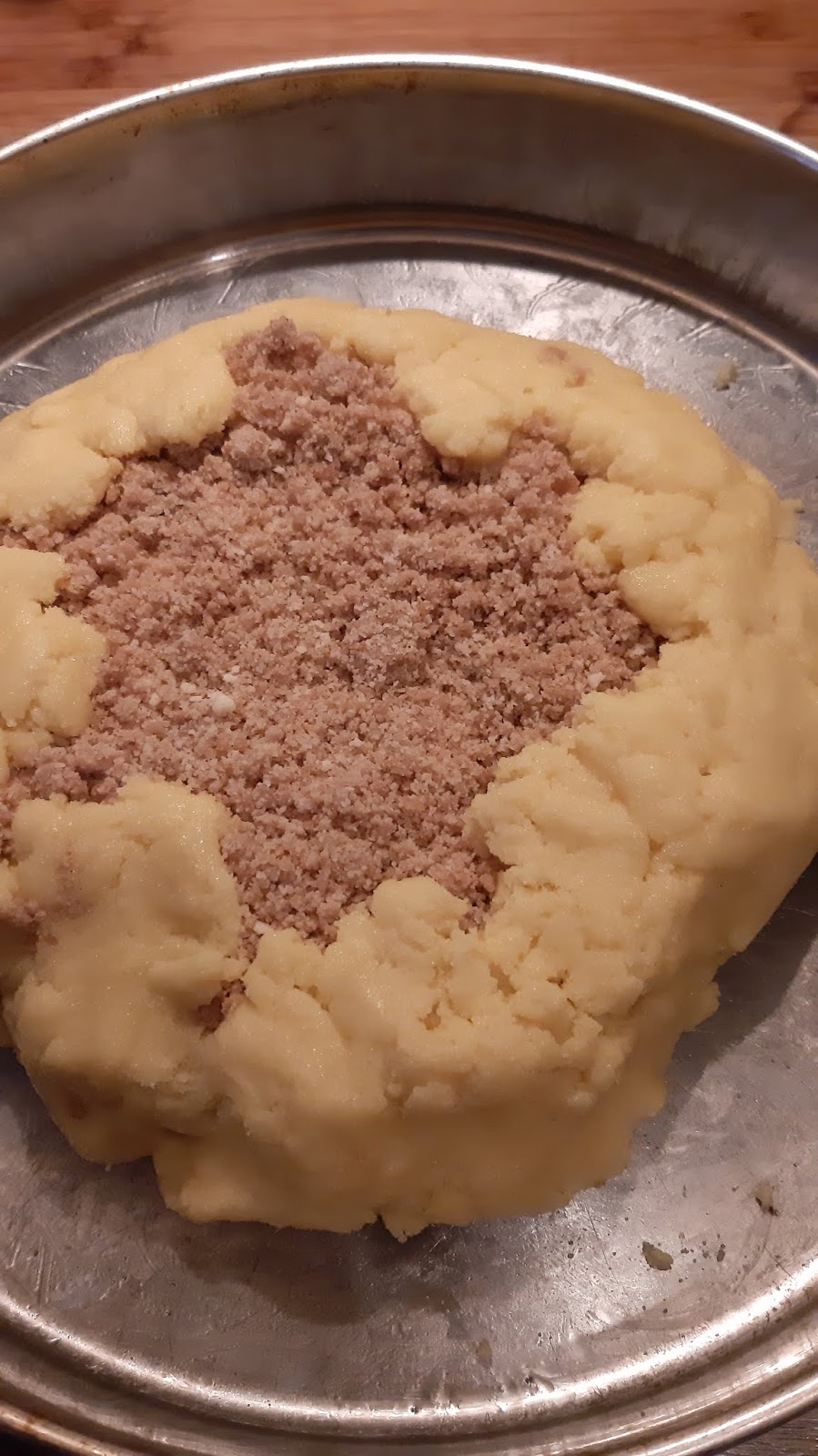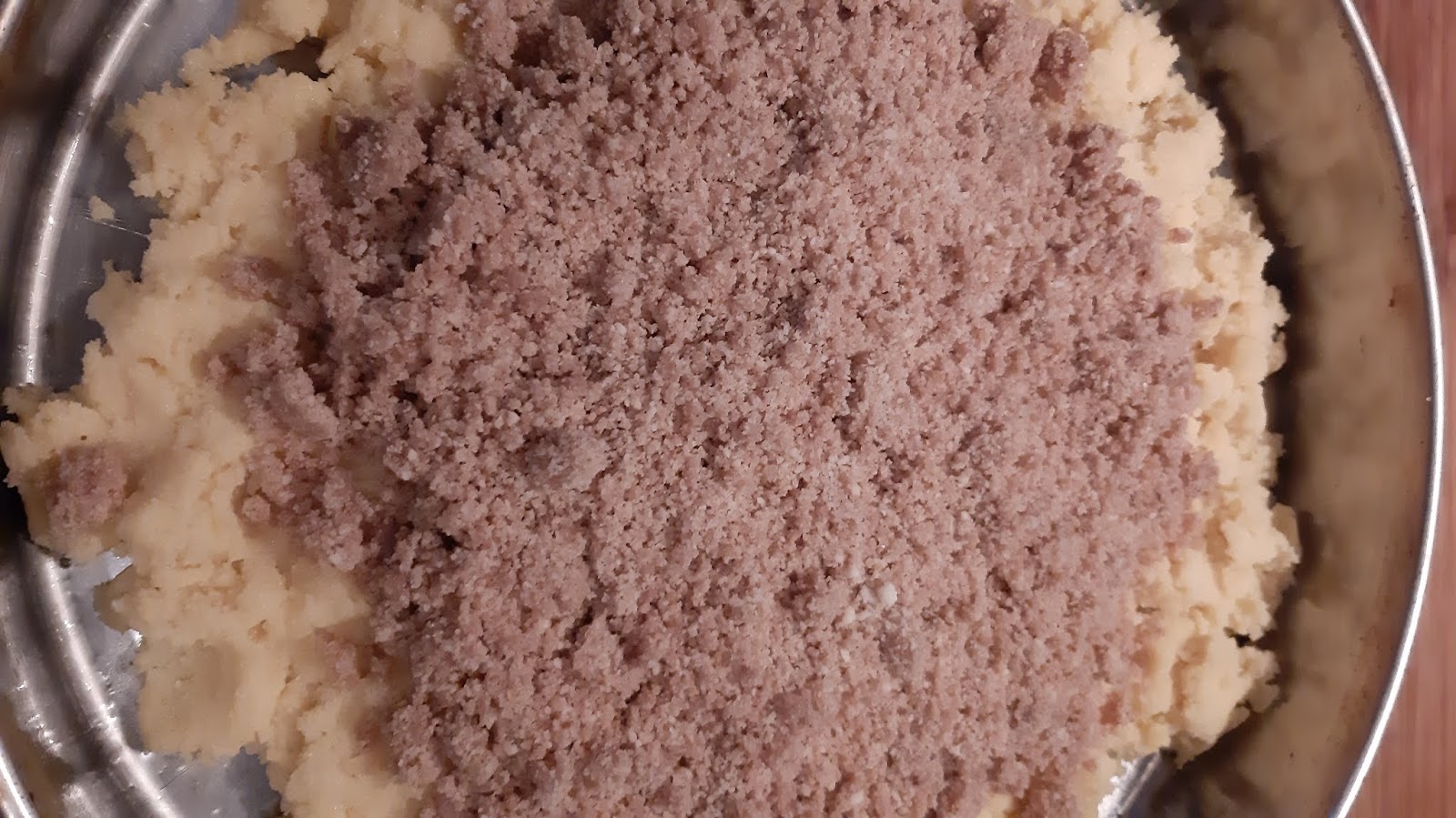 • Половината от сместа изсипвам в тавата и натискам с пръсти така, че да покрие почти цялото дъно, но не до край и да няма дупки.