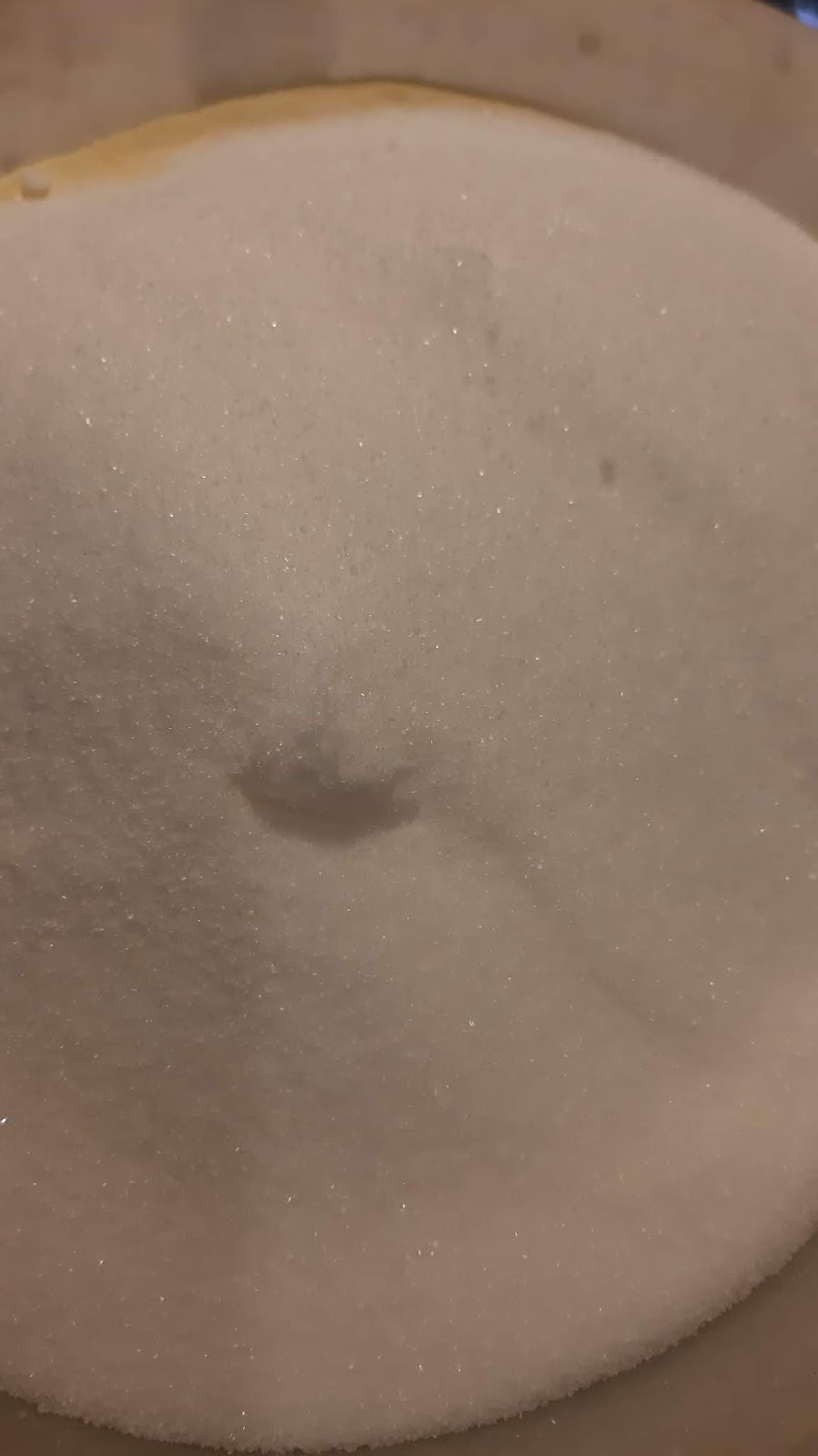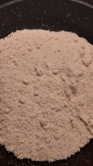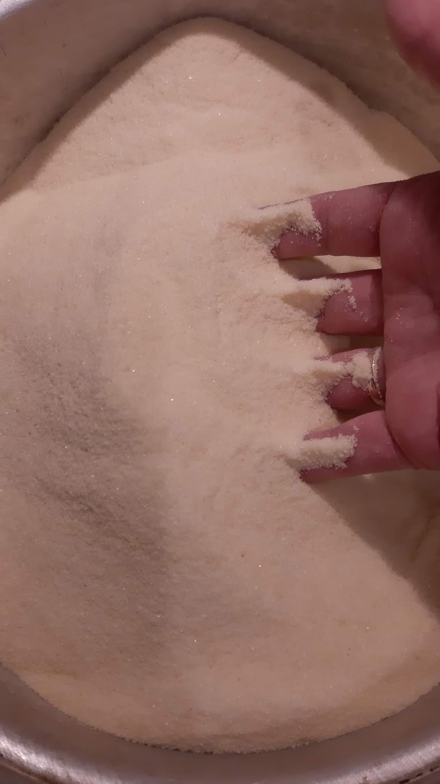 • Отмервам количеството грис. Препоръчва се, когато се изсипе в тавата за печене, количеството в тавата да е поне един сантиметър или пробвате ето така с пръст. Така със сигурност знаете, че и тавата е точен размер, че и сладкишът ще се получи.