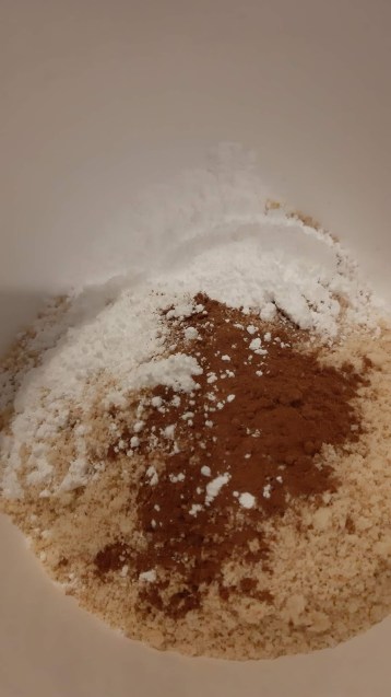 • В друга купа смесвам запечените и охладени бадеми с пудрата захар и канелата.
